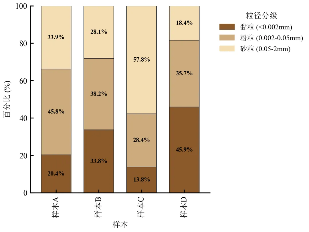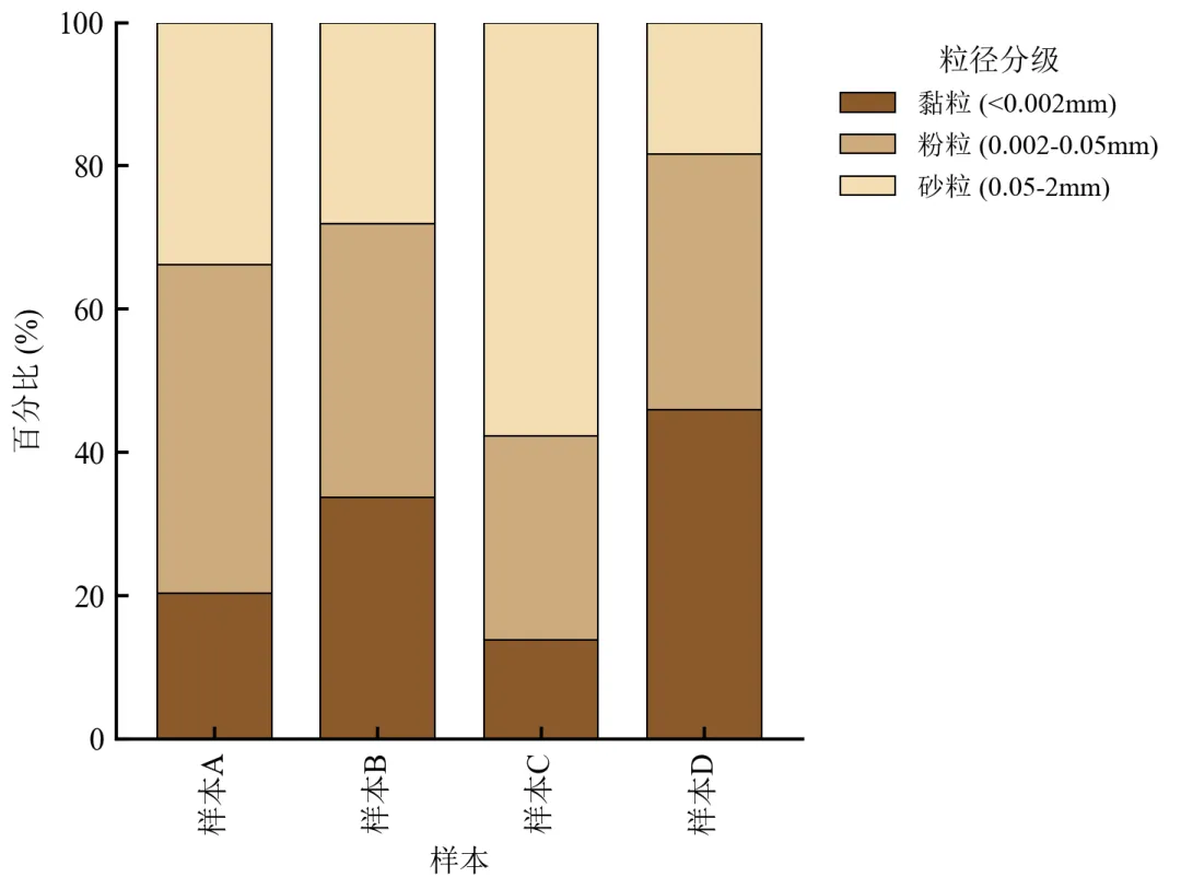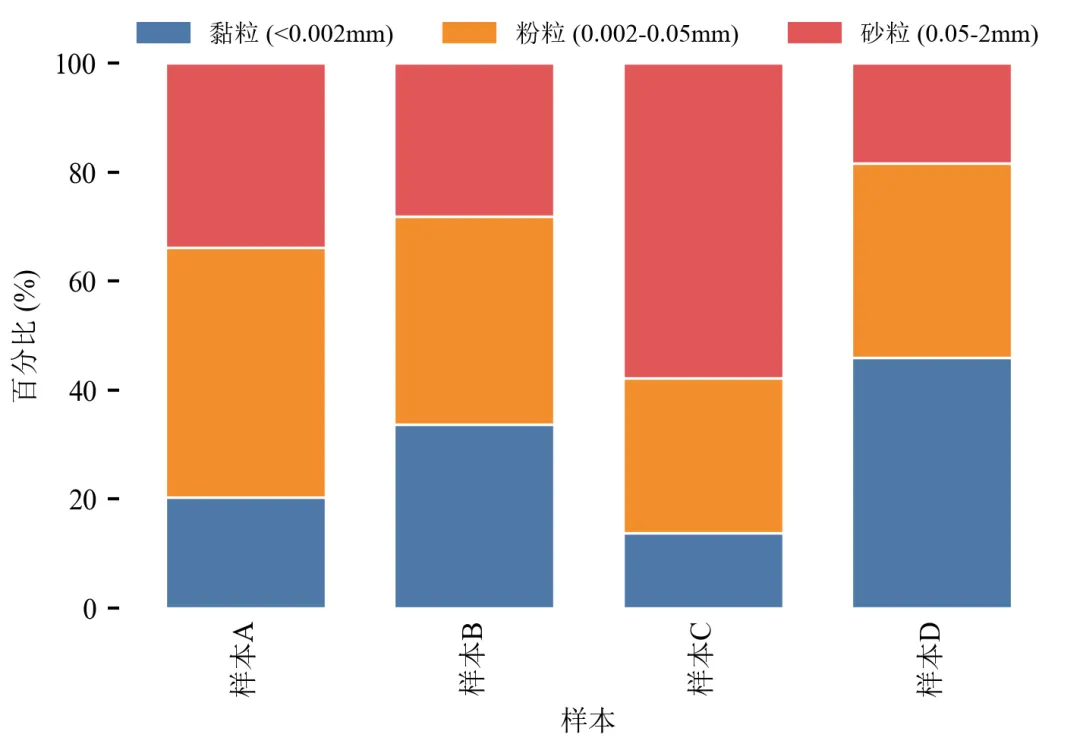 每个样本的条形总高度为100%,直观对比各样本中黏粒、粉粒、砂粒的占比差异。