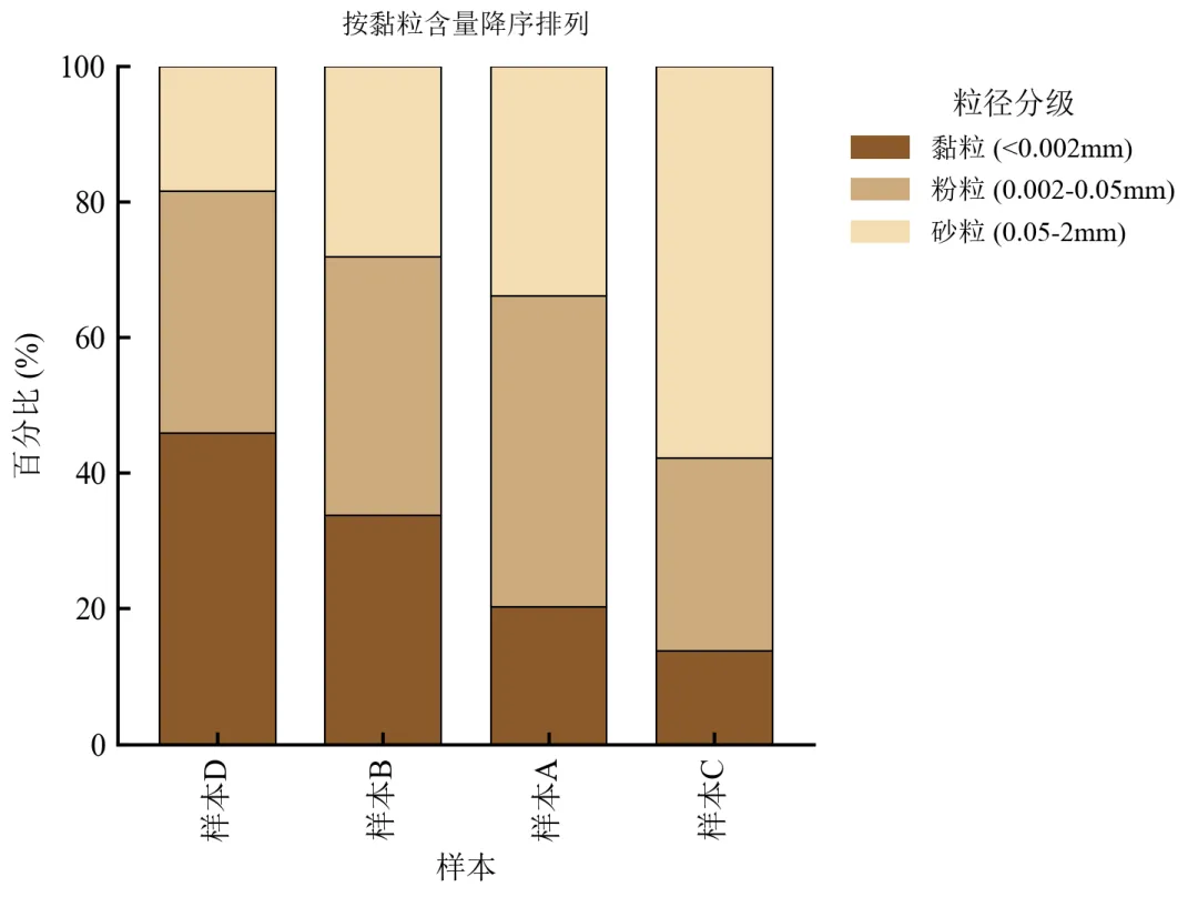 将样本按某一组分(如黏粒含量)降序排列,突出该组分的变化趋势。