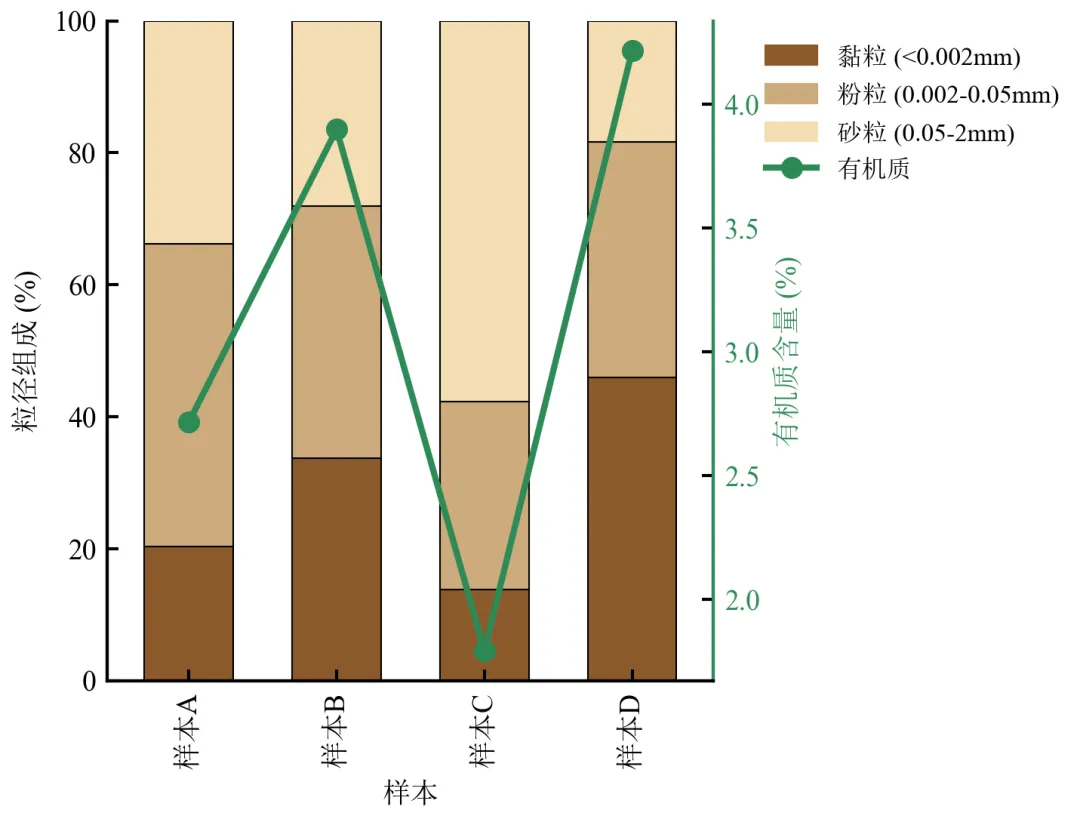 堆积条形图展示粒径组成,折线图展示有机质含量,揭示黏粒含量与有机质的正相关趋势。
