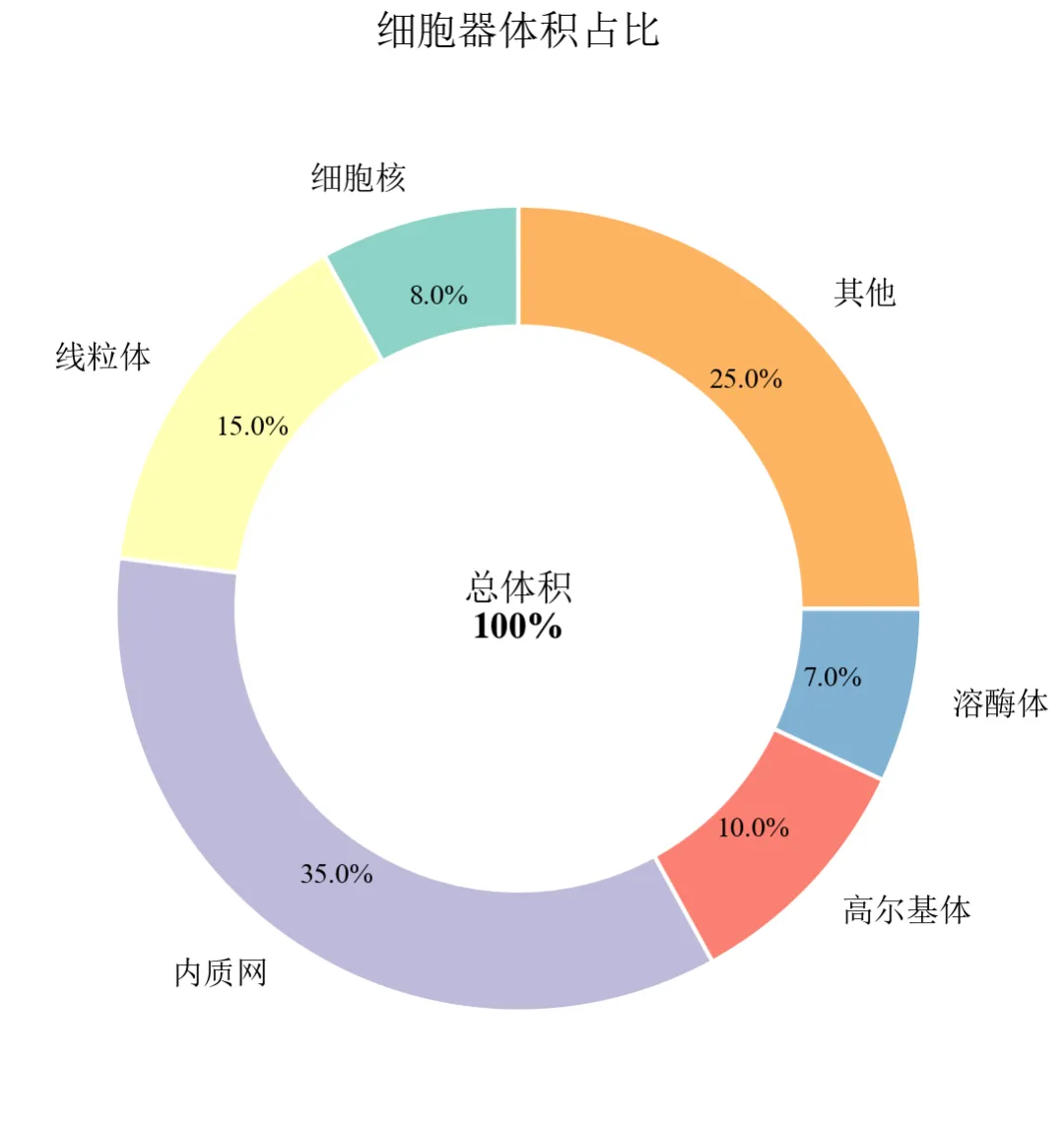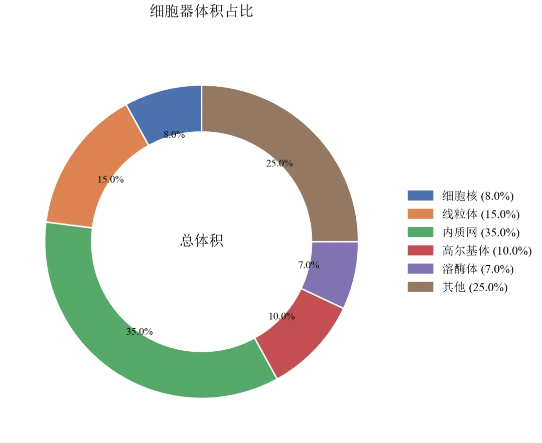 内质网占比最高(35%),线粒体15%,其他25%,直观展示细胞器体积构成。
