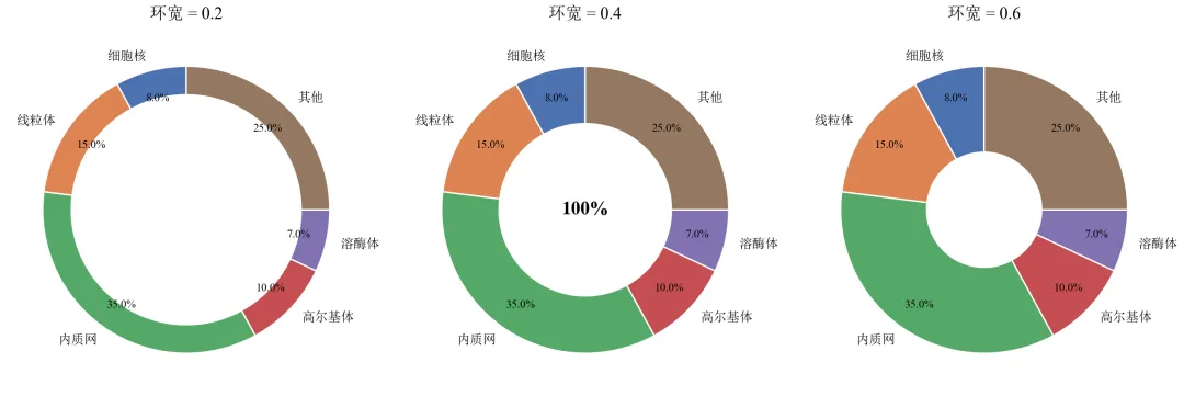 import pandas as pdimport matplotlib.pyplot as pltdefset_academic_style(): plt.rcParams['font.family'] = ['Times New Roman', 'SimSun'] plt.rcParams['font.size'] = 9 plt.rcParams['axes.unicode_minus'] = False plt.rcParams['axes.linewidth'] = 1.0 plt.rcParams['xtick.major.width'] = 1.0 plt.rcParams['ytick.major.width'] = 1.0 plt.rcParams['xtick.major.size'] = 3.5 plt.rcParams['ytick.major.size'] = 3.5 plt.rcParams['xtick.direction'] = 'in' plt.rcParams['ytick.direction'] = 'in' plt.rcParams['legend.frameon'] = False plt.rcParams['pdf.fonttype'] = 42 plt.rcParams['savefig.dpi'] = 300set_academic_style()df = pd.read_csv('细胞器体积数据.csv')# 自定义色板(模仿细胞器常见染色)colors = ['#4C72B0', '#DD8452', '#55A868', '#C44E52', '#8172B2', '#937860']fig, axes = plt.subplots(1, 3, figsize=(9.0, 3.2))widths = [0.2, 0.4, 0.6] # 不同环宽for ax, width in zip(axes, widths): wedges, texts, autotexts = ax.pie(df['体积占比'], labels=df['细胞器'], autopct='%1.1f%%', pctdistance=0.8, colors=colors, startangle=90, wedgeprops=dict(width=width, edgecolor='white', linewidth=0.8))for text in texts: text.set_fontsize(7)for autotext in autotexts: autotext.set_fontsize(6) ax.set_title(f'环宽 = {width:.1f}', fontsize=9)if width == widths[1]: ax.text(0, 0, '100%', ha='center', va='center', fontsize=10, fontweight='bold')plt.tight_layout()plt.show()fig.savefig('环形图_环宽对比.pdf', bbox_inches='tight', pad_inches=0.05)fig.savefig('环形图_环宽对比.png', bbox_inches='tight', pad_inches=0.05)执行结果分析: