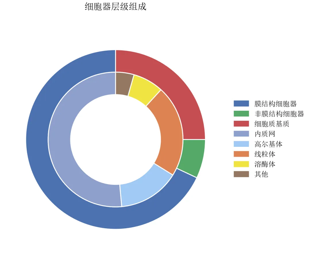 绘制内外两层环形图,展示不同粒度的组成(如细胞器大类与小类)。