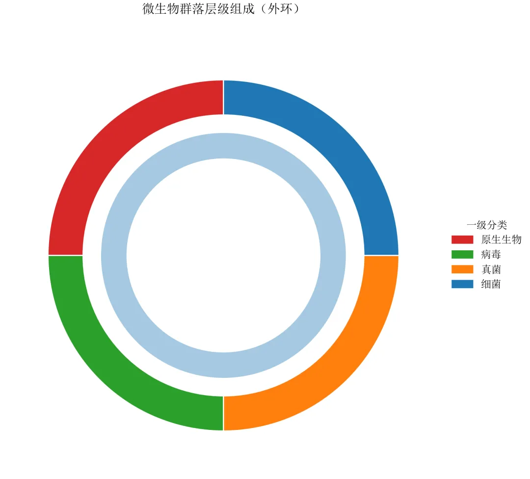 import pandas as pdimport numpy as npimport matplotlib.pyplot as pltdefset_academic_style(): plt.rcParams['font.family'] = ['Times New Roman', 'SimSun'] plt.rcParams['font.size'] = 9 plt.rcParams['axes.unicode_minus'] = False plt.rcParams['axes.linewidth'] = 1.0 plt.rcParams['xtick.major.width'] = 1.0 plt.rcParams['ytick.major.width'] = 1.0 plt.rcParams['xtick.major.size'] = 3.5 plt.rcParams['ytick.major.size'] = 3.5 plt.rcParams['xtick.direction'] = 'in' plt.rcParams['ytick.direction'] = 'in' plt.rcParams['legend.frameon'] = False plt.rcParams['pdf.fonttype'] = 42 plt.rcParams['savefig.dpi'] = 300set_academic_style()df = pd.read_csv('微生物层级数据.csv')# 计算一级分类占比(作为外环)level1 = df.groupby('一级分类')['百分比'].sum().reset_index()level1_sizes = level1['百分比'].valueslevel1_labels = level1['一级分类'].values# 颜色方案(一级分类用深色,二级用浅色)colors_l1 = {'细菌': '#1F77B4', '真菌': '#FF7F0E', '病毒': '#2CA02C', '原生生物': '#D62728'}# 二级分类颜色:基于一级颜色生成浅色版本(简化:使用同一色系)deflighten_color(color, factor=0.5):# 简单线性插值向白色靠拢import matplotlib.colors as mc c = mc.to_rgb(color)return tuple([1 - (1 - x)*factor for x in c])# 计算外环起止角度(总和为360度)cumsum = np.cumsum(level1_sizes)starts = np.concatenate([[0], cumsum[:-1]]) / 100 * 360ends = cumsum / 100 * 360fig, ax = plt.subplots(figsize=(7.0, 6.0))# 绘制外环(一级分类)wedges_outer, _ = ax.pie(level1_sizes, labels=None, colors=[colors_l1[l] for l in level1_labels], startangle=90, radius=1.0, wedgeprops=dict(width=0.2, edgecolor='white', linewidth=1))# 绘制内环(二级分类)及连接线radius_inner = 0.7# 内环外半径width_inner = 0.15# 内环宽度for i, l1 in enumerate(level1_labels): start_angle = starts[i] end_angle = ends[i]# 该一级分类下的二级数据 sub = df[df['一级分类'] == l1] sub_sizes = sub['百分比'].values sub_labels = sub['二级分类'].values# 二级分类在子扇区中的比例(相对于该一级分类总百分比) sub_pcts = sub_sizes / level1_sizes[i]# 计算子扇区起止角度 sub_starts = start_angle + np.concatenate([[0], np.cumsum(sub_pcts[:-1])]) * (end_angle - start_angle) sub_ends = start_angle + np.cumsum(sub_pcts) * (end_angle - start_angle)# 二级颜色:基于一级颜色变浅 base_color = colors_l1[l1]for j, (s_start, s_end) in enumerate(zip(sub_starts, sub_ends)):# 内环扇形 ax.pie([sub_sizes[j]], labels=None, colors=[lighten_color(base_color, 0.7 - j*0.1)], startangle=90, radius=radius_inner, wedgeprops=dict(width=width_inner, edgecolor='white', linewidth=0.8), counterclock=False)# 由于pie每次重置角度,需手动放置;此处采用更简便方法:直接用Wedge绘制# 添加图例handles = [plt.Rectangle((0,0),1,1, color=colors_l1[l]) for l in level1_labels]ax.legend(handles, level1_labels, loc='center left', bbox_to_anchor=(1.0, 0.5), fontsize=9, frameon=False, title='一级分类')ax.set_title('微生物群落层级组成(外环)', fontsize=11, pad=20)plt.tight_layout()plt.show()fig.savefig('母子饼图_基础.pdf', bbox_inches='tight', pad_inches=0.05)fig.savefig('母子饼图_基础.png', bbox_inches='tight', pad_inches=0.05)执行结果分析:
