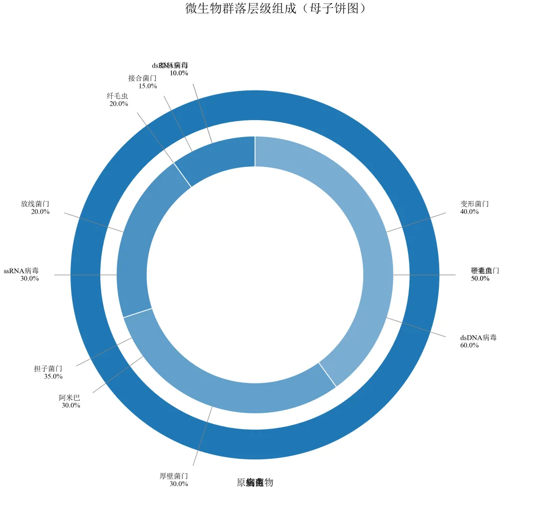 import pandas as pdimport numpy as npimport matplotlib.pyplot as pltfrom matplotlib.patches import Wedgeimport matplotlib.colors as mcdefset_academic_style(): plt.rcParams['font.family'] = ['Times New Roman', 'SimSun'] plt.rcParams['font.size'] = 9 plt.rcParams['axes.unicode_minus'] = False plt.rcParams['axes.linewidth'] = 1.0 plt.rcParams['xtick.major.width'] = 1.0 plt.rcParams['ytick.major.width'] = 1.0 plt.rcParams['xtick.major.size'] = 3.5 plt.rcParams['ytick.major.size'] = 3.5 plt.rcParams['xtick.direction'] = 'in' plt.rcParams['ytick.direction'] = 'in' plt.rcParams['legend.frameon'] = False plt.rcParams['pdf.fonttype'] = 42 plt.rcParams['savefig.dpi'] = 300set_academic_style()deflighten_color(color, factor=0.5): c = mc.to_rgb(color)return tuple([1 - (1 - x)*factor for x in c])df = pd.read_csv('微生物层级数据.csv')# 计算一级分类占比level1 = df.groupby('一级分类')['百分比'].sum().reset_index()level1_sizes = level1['百分比'].valueslevel1_labels = level1['一级分类'].valuescolors_l1 = {'细菌': '#1F77B4', '真菌': '#FF7F0E', '病毒': '#2CA02C', '原生生物': '#D62728'}# 计算外环起止角度(从90度开始,顺时针)cumsum_l1 = np.cumsum(level1_sizes)starts_l1 = np.concatenate([[0], cumsum_l1[:-1]]) / 100 * 360ends_l1 = cumsum_l1 / 100 * 360fig, ax = plt.subplots(figsize=(8.0, 7.0))ax.set_xlim(-1.5, 1.8)ax.set_ylim(-1.5, 1.5)ax.set_aspect('equal')ax.axis('off')# 绘制外环(一级分类)outer_radius = 1.2outer_width = 0.2for i, l1 in enumerate(level1_labels): wedge = Wedge((0,0), outer_radius, 90 - ends_l1[i], 90 - starts_l1[i], width=outer_width, facecolor=colors_l1[l1], edgecolor='white', linewidth=1) ax.add_patch(wedge)# 外环标签(置于环外中部) mid_angle = (starts_l1[i] + ends_l1[i]) / 2 rad = outer_radius + 0.15 x = rad * np.cos(np.radians(90 - mid_angle)) y = rad * np.sin(np.radians(90 - mid_angle)) ax.text(x, y, l1, ha='center', va='center', fontsize=9, fontweight='bold')# 绘制内环(二级分类)及连接线inner_outer_radius = 0.9inner_width = 0.2for i, l1 in enumerate(level1_labels): sub = df[df['一级分类'] == l1] sub_sizes = sub['百分比'].values sub_labels = sub['二级分类'].values# 子扇区比例 sub_pcts = sub_sizes / level1_sizes[i] sub_starts = starts_l1[i] + np.concatenate([[0], np.cumsum(sub_pcts[:-1])]) * (ends_l1[i] - starts_l1[i]) sub_ends = starts_l1[i] + np.cumsum(sub_pcts) * (ends_l1[i] - starts_l1[i]) base_color = colors_l1[l1]for j, (s_start, s_end) in enumerate(zip(sub_starts, sub_ends)):# 内环扇形 wedge_inner = Wedge((0,0), inner_outer_radius, 90 - s_end, 90 - s_start, width=inner_width, facecolor=lighten_color(base_color, 0.6 + j*0.1), edgecolor='white', linewidth=0.8) ax.add_patch(wedge_inner)# 连接线(从内环外边缘指向标签) mid = (s_start + s_end) / 2# 起点:内环外边缘 x_start = inner_outer_radius * np.cos(np.radians(90 - mid)) y_start = inner_outer_radius * np.sin(np.radians(90 - mid))# 终点:向外延伸 line_length = 0.4 x_end = (inner_outer_radius + line_length) * np.cos(np.radians(90 - mid)) y_end = (inner_outer_radius + line_length) * np.sin(np.radians(90 - mid)) ax.plot([x_start, x_end], [y_start, y_end], color='gray', linewidth=0.5, linestyle='-')# 标签位置(略远于线终点) label_rad = inner_outer_radius + line_length + 0.1 x_label = label_rad * np.cos(np.radians(90 - mid)) y_label = label_rad * np.sin(np.radians(90 - mid)) ha = 'left'if x_label > 0else'right' ax.text(x_label, y_label, f'{sub_labels[j]}\n{sub_sizes[j]:.1f}%', ha=ha, va='center', fontsize=7)ax.set_title('微生物群落层级组成(母子饼图)', fontsize=12, pad=30)plt.tight_layout()plt.show()fig.savefig('母子饼图_完整版.pdf', bbox_inches='tight', pad_inches=0.05)fig.savefig('母子饼图_完整版.png', bbox_inches='tight', pad_inches=0.05)执行结果分析: