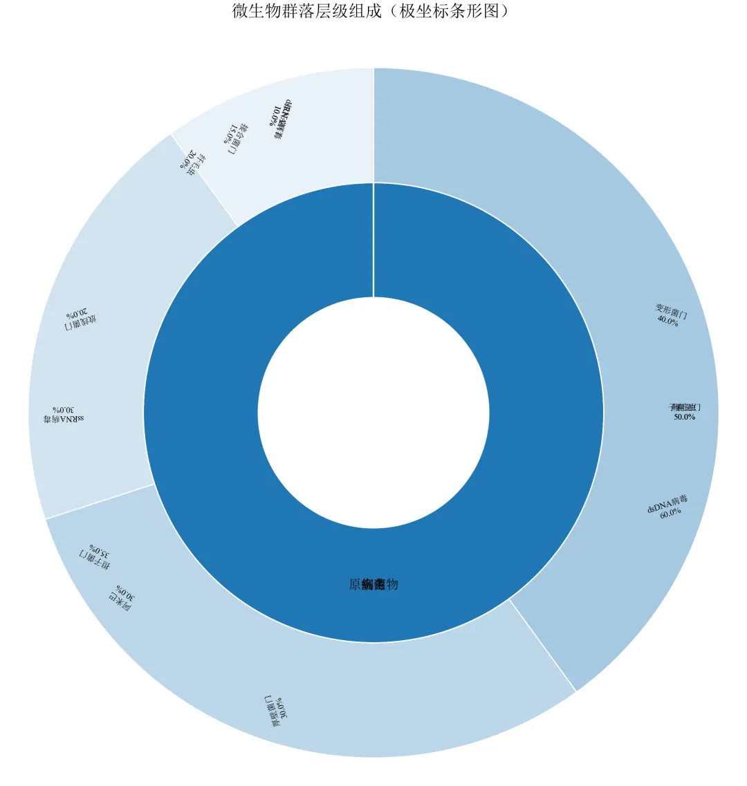 import pandas as pdimport numpy as npimport matplotlib.pyplot as pltfrom matplotlib.colors import to_rgb, to_hexdefset_academic_style(): plt.rcParams['font.family'] = ['Times New Roman', 'SimSun'] plt.rcParams['font.size'] = 9 plt.rcParams['axes.unicode_minus'] = False plt.rcParams['axes.linewidth'] = 1.0 plt.rcParams['xtick.major.width'] = 1.0 plt.rcParams['ytick.major.width'] = 1.0 plt.rcParams['xtick.major.size'] = 3.5 plt.rcParams['ytick.major.size'] = 3.5 plt.rcParams['xtick.direction'] = 'in' plt.rcParams['ytick.direction'] = 'in' plt.rcParams['legend.frameon'] = False plt.rcParams['pdf.fonttype'] = 42 plt.rcParams['savefig.dpi'] = 300deflighten_color(color, amount=0.5):""" 将颜色变浅或变深 amount: 0=完全变黑, 1=完全变白, 0.5=原色 """ rgb = to_rgb(color) white = (1.0, 1.0, 1.0) mixed = [c * (1 - amount) + w * amount for c, w in zip(rgb, white)]return to_hex(mixed)set_academic_style()df = pd.read_csv('微生物层级数据.csv')level1 = df.groupby('一级分类')['百分比'].sum().reset_index()level1_sizes = level1['百分比'].valueslevel1_labels = level1['一级分类'].valuescolors_l1 = {'细菌': '#1F77B4', '真菌': '#FF7F0E', '病毒': '#2CA02C', '原生生物': '#D62728'}# 准备极坐标条形图数据# 内层:一级分类(半径0.5~1.0),外层:二级分类(半径1.0~1.5)fig, ax = plt.subplots(figsize=(8.0, 8.0), subplot_kw={'projection': 'polar'})ax.set_theta_direction(-1)ax.set_theta_offset(np.pi/2)# 绘制一级分类(内环)cumsum = np.cumsum(level1_sizes)starts = np.concatenate([[0], cumsum[:-1]]) / 100 * 2*np.piends = cumsum / 100 * 2*np.pifor i, (start, end, label) in enumerate(zip(starts, ends, level1_labels)): ax.bar(x=(start+end)/2, height=0.5, width=end-start, bottom=0.5, color=colors_l1[label], edgecolor='white', linewidth=1)# 标签 ax.text((start+end)/2, 0.75, label, ha='center', va='center', fontsize=9, fontweight='bold')# 绘制二级分类(外环)for i, l1 in enumerate(level1_labels): sub = df[df['一级分类'] == l1] sub_sizes = sub['百分比'].values sub_labels = sub['二级分类'].values sub_pcts = sub_sizes / level1_sizes[i] sub_starts = starts[i] + np.concatenate([[0], np.cumsum(sub_pcts[:-1])]) * (ends[i] - starts[i]) sub_ends = starts[i] + np.cumsum(sub_pcts) * (ends[i] - starts[i]) base_color = colors_l1[l1]for j, (s_start, s_end) in enumerate(zip(sub_starts, sub_ends)): ax.bar(x=(s_start+s_end)/2, height=0.5, width=s_end-s_start, bottom=1.0, color=lighten_color(base_color, 0.6 + j*0.1), edgecolor='white', linewidth=0.8)# 标签角度 mid = (s_start + s_end) / 2 ax.text(mid, 1.35, f'{sub_labels[j]}\n{sub_sizes[j]:.1f}%', ha='center', va='center', fontsize=6, rotation=np.degrees(mid)-90)ax.set_ylim(0, 1.6)ax.set_xticks([])ax.set_yticks([])ax.spines['polar'].set_visible(False)ax.set_title('微生物群落层级组成(极坐标条形图)', fontsize=12, pad=20)plt.tight_layout()plt.show()fig.savefig('母子饼图_极坐标模拟.pdf', bbox_inches='tight', pad_inches=0.05)fig.savefig('母子饼图_极坐标模拟.png', bbox_inches='tight', pad_inches=0.05)执行结果分析: