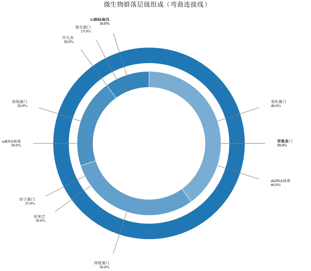import pandas as pdimport numpy as npimport matplotlib.pyplot as pltfrom matplotlib.patches import Wedge, FancyArrowPatchimport matplotlib.colors as mcdefset_academic_style(): plt.rcParams['font.family'] = ['Times New Roman', 'SimSun'] plt.rcParams['font.size'] = 9 plt.rcParams['axes.unicode_minus'] = False plt.rcParams['axes.linewidth'] = 1.0 plt.rcParams['xtick.major.width'] = 1.0 plt.rcParams['ytick.major.width'] = 1.0 plt.rcParams['xtick.major.size'] = 3.5 plt.rcParams['ytick.major.size'] = 3.5 plt.rcParams['xtick.direction'] = 'in' plt.rcParams['ytick.direction'] = 'in' plt.rcParams['legend.frameon'] = False plt.rcParams['pdf.fonttype'] = 42 plt.rcParams['savefig.dpi'] = 300set_academic_style()deflighten_color(color, factor=0.5): c = mc.to_rgb(color)return tuple([1 - (1 - x)*factor for x in c])df = pd.read_csv('微生物层级数据.csv')level1 = df.groupby('一级分类')['百分比'].sum().reset_index()level1_sizes = level1['百分比'].valueslevel1_labels = level1['一级分类'].valuescolors_l1 = {'细菌': '#1F77B4', '真菌': '#FF7F0E', '病毒': '#2CA02C', '原生生物': '#D62728'}cumsum_l1 = np.cumsum(level1_sizes)starts_l1 = np.concatenate([[0], cumsum_l1[:-1]]) / 100 * 360ends_l1 = cumsum_l1 / 100 * 360fig, ax = plt.subplots(figsize=(8.0, 7.0))ax.set_xlim(-1.8, 2.0)ax.set_ylim(-1.5, 1.5)ax.set_aspect('equal')ax.axis('off')outer_radius = 1.2outer_width = 0.2for i, l1 in enumerate(level1_labels): wedge = Wedge((0,0), outer_radius, 90 - ends_l1[i], 90 - starts_l1[i], width=outer_width, facecolor=colors_l1[l1], edgecolor='white', linewidth=1) ax.add_patch(wedge)inner_outer_radius = 0.9inner_width = 0.2for i, l1 in enumerate(level1_labels): sub = df[df['一级分类'] == l1] sub_sizes = sub['百分比'].values sub_labels = sub['二级分类'].values sub_pcts = sub_sizes / level1_sizes[i] sub_starts = starts_l1[i] + np.concatenate([[0], np.cumsum(sub_pcts[:-1])]) * (ends_l1[i] - starts_l1[i]) sub_ends = starts_l1[i] + np.cumsum(sub_pcts) * (ends_l1[i] - starts_l1[i]) base_color = colors_l1[l1]for j, (s_start, s_end) in enumerate(zip(sub_starts, sub_ends)): wedge_inner = Wedge((0,0), inner_outer_radius, 90 - s_end, 90 - s_start, width=inner_width, facecolor=lighten_color(base_color, 0.6 + j*0.1), edgecolor='white', linewidth=0.8) ax.add_patch(wedge_inner) mid = (s_start + s_end) / 2# 弯曲连接线(贝塞尔) x_start = inner_outer_radius * np.cos(np.radians(90 - mid)) y_start = inner_outer_radius * np.sin(np.radians(90 - mid))# 控制点(径向向外并偏移) ctrl_rad = inner_outer_radius + 0.25 x_ctrl = ctrl_rad * np.cos(np.radians(90 - mid)) y_ctrl = ctrl_rad * np.sin(np.radians(90 - mid)) end_rad = inner_outer_radius + 0.55 x_end = end_rad * np.cos(np.radians(90 - mid)) y_end = end_rad * np.sin(np.radians(90 - mid))# 使用Path绘制曲线import matplotlib.path as mpath Path = mpath.Path verts = [(x_start, y_start), (x_ctrl, y_ctrl), (x_end, y_end)] codes = [Path.MOVETO, Path.CURVE3, Path.CURVE3] path = mpath.Path(verts, codes) patch = plt.matplotlib.patches.PathPatch(path, facecolor='none', edgecolor='gray', linewidth=0.8) ax.add_patch(patch)# 标签 label_rad = end_rad + 0.15 x_label = label_rad * np.cos(np.radians(90 - mid)) y_label = label_rad * np.sin(np.radians(90 - mid)) ha = 'left'if x_label > 0else'right' ax.text(x_label, y_label, f'{sub_labels[j]}\n{sub_sizes[j]:.1f}%', ha=ha, va='center', fontsize=7)ax.set_title('微生物群落层级组成(弯曲连接线)', fontsize=12, pad=30)plt.tight_layout()plt.show()fig.savefig('母子饼图_弯曲连接线.pdf', bbox_inches='tight', pad_inches=0.05)fig.savefig('母子饼图_弯曲连接线.png', bbox_inches='tight', pad_inches=0.05)执行结果分析: