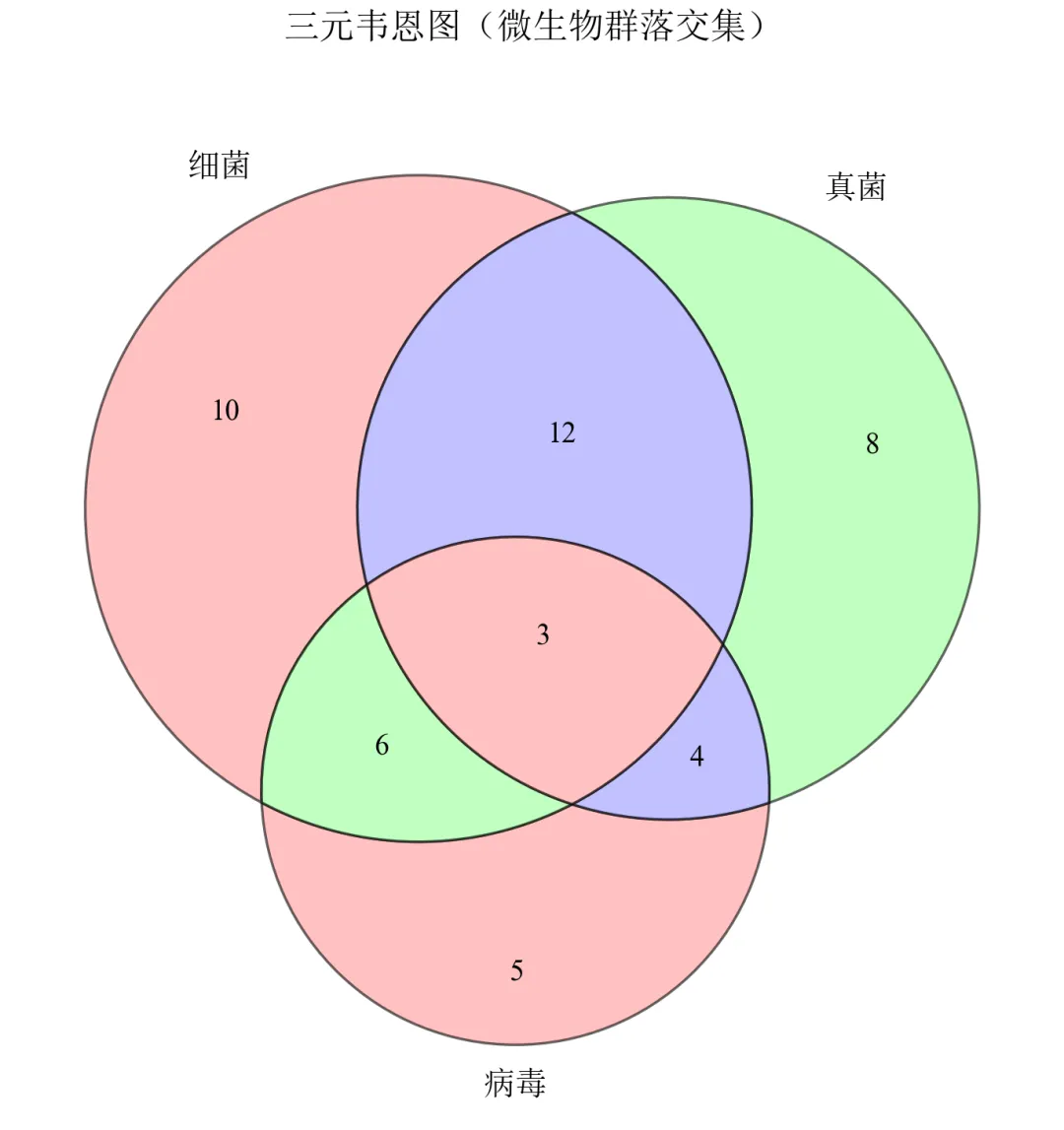 # 首先安装库:pip install matplotlib-vennimport matplotlib.pyplot as pltfrom matplotlib_venn import venn3defset_academic_style(): plt.rcParams['font.family'] = ['Times New Roman', 'SimSun'] plt.rcParams['font.size'] = 9 plt.rcParams['axes.unicode_minus'] = False plt.rcParams['axes.linewidth'] = 1.0 plt.rcParams['xtick.major.width'] = 1.0 plt.rcParams['ytick.major.width'] = 1.0 plt.rcParams['xtick.major.size'] = 3.5 plt.rcParams['ytick.major.size'] = 3.5 plt.rcParams['xtick.direction'] = 'in' plt.rcParams['ytick.direction'] = 'in' plt.rcParams['legend.frameon'] = False plt.rcParams['pdf.fonttype'] = 42 plt.rcParams['savefig.dpi'] = 300set_academic_style()# 定义三个集合及其交集大小(韦恩图七个区域的数值)# 集合A、B、C的基数及两两交集、三交集subsets = (10, 8, 12, 5, 6, 4, 3) # (Abc, aBc, ABc, abC, AbC, aBC, ABC)# 集合标签labels = ('细菌', '真菌', '病毒')fig, ax = plt.subplots(figsize=(5.0, 5.0))venn = venn3(subsets=subsets, set_labels=labels, ax=ax)# 自定义颜色colors = ['#FF9999', '#99FF99', '#9999FF']for i, patch in enumerate(venn.patches):if patch: patch.set_facecolor(colors[i % 3]) patch.set_alpha(0.6) patch.set_edgecolor('black') patch.set_linewidth(0.8)# 调整标签字体for text in venn.set_labels:if text: text.set_fontsize(10) text.set_fontweight('bold')for text in venn.subset_labels:if text: text.set_fontsize(9)ax.set_title('三元韦恩图(微生物群落交集)', fontsize=11, pad=20)plt.tight_layout()plt.show()fig.savefig('三元韦恩图_基础.pdf', bbox_inches='tight', pad_inches=0.05)fig.savefig('三元韦恩图_基础.png', bbox_inches='tight', pad_inches=0.05)执行结果分析: