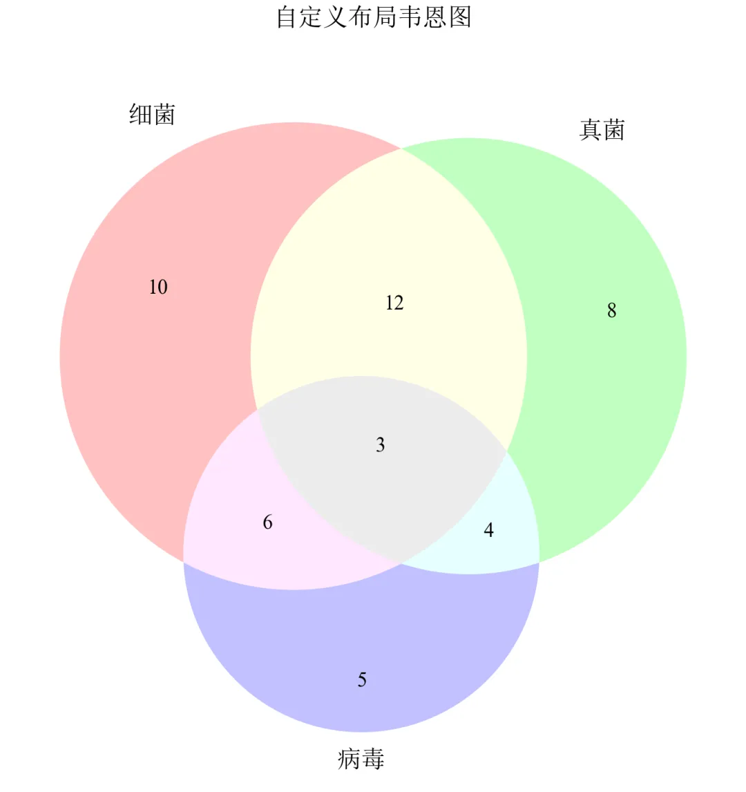 import matplotlib.pyplot as pltfrom matplotlib_venn import venn3, venn3_circlesdefset_academic_style(): plt.rcParams['font.family'] = ['Times New Roman', 'SimSun'] plt.rcParams['font.size'] = 9 plt.rcParams['axes.unicode_minus'] = False plt.rcParams['axes.linewidth'] = 1.0 plt.rcParams['xtick.major.width'] = 1.0 plt.rcParams['ytick.major.width'] = 1.0 plt.rcParams['xtick.major.size'] = 3.5 plt.rcParams['ytick.major.size'] = 3.5 plt.rcParams['xtick.direction'] = 'in' plt.rcParams['ytick.direction'] = 'in' plt.rcParams['legend.frameon'] = False plt.rcParams['pdf.fonttype'] = 42 plt.rcParams['savefig.dpi'] = 300set_academic_style()subsets = (10, 8, 12, 5, 6, 4, 3)labels = ('细菌', '真菌', '病毒')fig, ax = plt.subplots(figsize=(5.0, 5.0))# 自定义布局:三个圆的圆心坐标和半径# 格式:[(x, y, radius), ...]circles = [(0.0, 0.0, 0.4), (0.35, -0.2, 0.4), (-0.35, -0.2, 0.4)]venn = venn3(subsets=subsets, set_labels=labels, ax=ax, set_colors=('#FF9999', '#99FF99', '#9999FF'), alpha=0.6)ax.set_title('自定义布局韦恩图', fontsize=11, pad=20)plt.tight_layout()plt.show()fig.savefig('三元韦恩图_自定义布局.pdf', bbox_inches='tight', pad_inches=0.05)fig.savefig('三元韦恩图_自定义布局.png', bbox_inches='tight', pad_inches=0.05)执行结果分析: