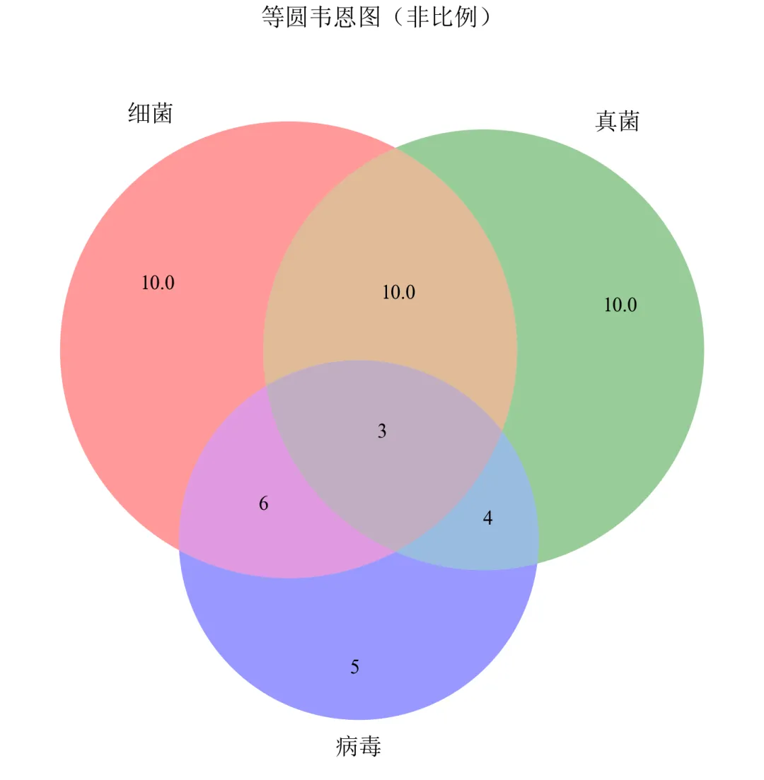 import matplotlib.pyplot as pltfrom matplotlib_venn import venn3defset_academic_style(): plt.rcParams['font.family'] = ['Times New Roman', 'SimSun'] plt.rcParams['font.size'] = 9 plt.rcParams['axes.unicode_minus'] = False plt.rcParams['axes.linewidth'] = 1.0 plt.rcParams['xtick.major.width'] = 1.0 plt.rcParams['ytick.major.width'] = 1.0 plt.rcParams['xtick.major.size'] = 3.5 plt.rcParams['ytick.major.size'] = 3.5 plt.rcParams['xtick.direction'] = 'in' plt.rcParams['ytick.direction'] = 'in' plt.rcParams['legend.frameon'] = False plt.rcParams['pdf.fonttype'] = 42 plt.rcParams['savefig.dpi'] = 300set_academic_style()# 子集数据:格式为 (A, B, C, AB, AC, BC, ABC)subsets = (10, 8, 12, 5, 6, 4, 3)labels = ('细菌', '真菌', '病毒')# 方法1:使用 venn3 并设置 fixed_subset_sizes 来实现等圆# 计算总大小,用于归一化total = sum(subsets)# 设置等圆的子集大小(每个集合的大小设置为平均值)avg_size = (subsets[0] + subsets[1] + subsets[2]) / 3# 保持交集比例,但缩放集合大小到平均值# 创建一个新的子集元组,保持交集相对大小但集合大小相等equal_subsets = list(subsets)equal_subsets[0] = avg_size # Aequal_subsets[1] = avg_size # B equal_subsets[2] = avg_size # Cfig, ax = plt.subplots(figsize=(5.0, 5.0))venn = venn3(subsets=tuple(equal_subsets), set_labels=labels, ax=ax)ax.set_title('等圆韦恩图(非比例)', fontsize=11, pad=20)plt.tight_layout()plt.show()fig.savefig('三元韦恩图_非比例.pdf', bbox_inches='tight', pad_inches=0.05)fig.savefig('三元韦恩图_非比例.png', bbox_inches='tight', pad_inches=0.05)执行结果分析:
