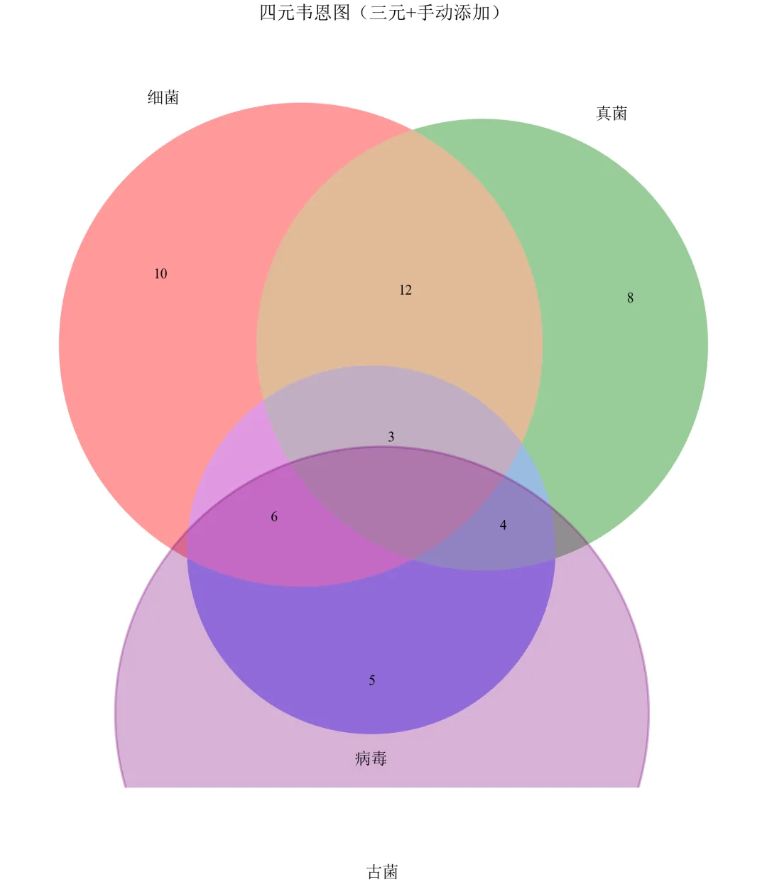 import matplotlib.pyplot as pltfrom matplotlib_venn import venn3from matplotlib.patches import Circledefset_academic_style(): plt.rcParams['font.family'] = ['Times New Roman', 'SimSun'] plt.rcParams['font.size'] = 9 plt.rcParams['axes.unicode_minus'] = False plt.rcParams['axes.linewidth'] = 1.0 plt.rcParams['xtick.major.width'] = 1.0 plt.rcParams['ytick.major.width'] = 1.0 plt.rcParams['xtick.major.size'] = 3.5 plt.rcParams['ytick.major.size'] = 3.5 plt.rcParams['xtick.direction'] = 'in' plt.rcParams['ytick.direction'] = 'in' plt.rcParams['legend.frameon'] = False plt.rcParams['pdf.fonttype'] = 42 plt.rcParams['savefig.dpi'] = 300set_academic_style()# 创建图形fig, ax = plt.subplots(figsize=(8.0, 8.0))# 绘制三元韦恩图venn3(subsets=(10, 8, 12, 5, 6, 4, 3), set_labels=('细菌', '真菌', '病毒'), ax=ax)# 手动添加第四个圆(古菌)circle4 = Circle((0, -0.6), 0.5, alpha=0.3, color='purple', edgecolor='black', linewidth=1.5)ax.add_patch(circle4)ax.text(0, -0.9, '古菌', fontsize=11, ha='center', va='center')ax.set_title('四元韦恩图(三元+手动添加)', fontsize=12, pad=20)plt.tight_layout()plt.show()fig.savefig('四元韦恩图_备选.pdf', bbox_inches='tight', pad_inches=0.05)fig.savefig('四元韦恩图_备选.png', bbox_inches='tight', pad_inches=0.05)执行结果分析: