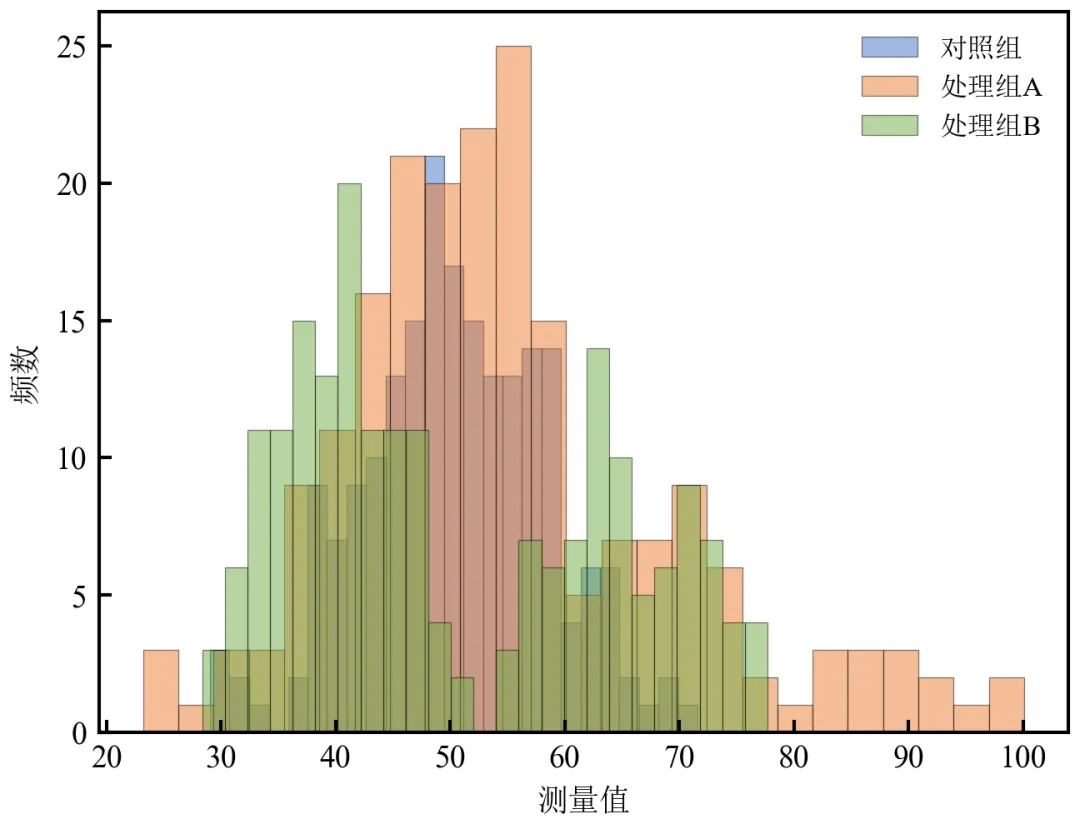 import pandas as pdimport numpy as npimport matplotlib.pyplot as plt# 学术样式设置defset_academic_style(): plt.rcParams['font.family'] = ['Times New Roman', 'SimSun'] plt.rcParams['font.size'] = 9 plt.rcParams['axes.unicode_minus'] = False plt.rcParams['axes.linewidth'] = 1.0 plt.rcParams['xtick.major.width'] = 1.0 plt.rcParams['ytick.major.width'] = 1.0 plt.rcParams['xtick.major.size'] = 3.5 plt.rcParams['ytick.major.size'] = 3.5 plt.rcParams['xtick.direction'] = 'in' plt.rcParams['ytick.direction'] = 'in' plt.rcParams['legend.frameon'] = False plt.rcParams['pdf.fonttype'] = 42 plt.rcParams['savefig.dpi'] = 300set_academic_style()# 读取数据df = pd.read_csv('三组实验数据.csv')# 定义各组颜色(色盲友好配色)colors = {'对照组': '#4472C4', '处理组A': '#ED7D31', '处理组B': '#70AD47'}fig, ax = plt.subplots(figsize=(4.5, 3.5))# 分组绘制直方图,alpha控制透明度for group in df['组别'].unique(): subset = df[df['组别'] == group]['测量值'] ax.hist(subset, bins=25, alpha=0.5, color=colors[group], edgecolor='black', linewidth=0.3, label=group)ax.set_xlabel('测量值')ax.set_ylabel('频数')ax.legend(loc='upper right', fontsize=8)plt.tight_layout()plt.show()fig.savefig('半透明堆叠直方图_基础.pdf', bbox_inches='tight', pad_inches=0.05)fig.savefig('半透明堆叠直方图_基础.png', bbox_inches='tight', pad_inches=0.05)执行结果分析: