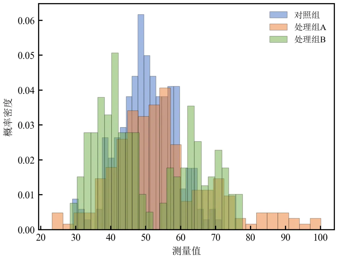 import pandas as pdimport numpy as npimport matplotlib.pyplot as pltdefset_academic_style(): plt.rcParams['font.family'] = ['Times New Roman', 'SimSun'] plt.rcParams['font.size'] = 9 plt.rcParams['axes.unicode_minus'] = False plt.rcParams['axes.linewidth'] = 1.0 plt.rcParams['xtick.major.width'] = 1.0 plt.rcParams['ytick.major.width'] = 1.0 plt.rcParams['xtick.major.size'] = 3.5 plt.rcParams['ytick.major.size'] = 3.5 plt.rcParams['xtick.direction'] = 'in' plt.rcParams['ytick.direction'] = 'in' plt.rcParams['legend.frameon'] = False plt.rcParams['pdf.fonttype'] = 42 plt.rcParams['savefig.dpi'] = 300set_academic_style()df = pd.read_csv('三组实验数据.csv')colors = {'对照组': '#4472C4', '处理组A': '#ED7D31', '处理组B': '#70AD47'}fig, ax = plt.subplots(figsize=(4.5, 3.5))for group in df['组别'].unique(): subset = df[df['组别'] == group]['测量值'] ax.hist(subset, bins=25, density=True, alpha=0.5, color=colors[group], edgecolor='black', linewidth=0.3, label=group)ax.set_xlabel('测量值')ax.set_ylabel('概率密度')ax.legend(loc='upper right', fontsize=8)plt.tight_layout()plt.show()fig.savefig('密度归一化直方图.pdf', bbox_inches='tight', pad_inches=0.05)fig.savefig('密度归一化直方图.png', bbox_inches='tight', pad_inches=0.05)执行结果分析: