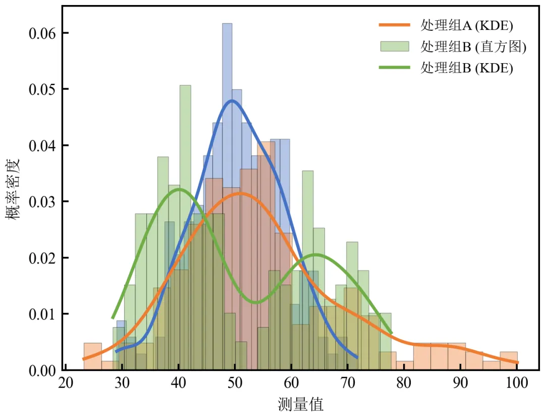 import pandas as pdimport numpy as npimport matplotlib.pyplot as pltfrom scipy.stats import gaussian_kdedefset_academic_style(): plt.rcParams['font.family'] = ['Times New Roman', 'SimSun'] plt.rcParams['font.size'] = 9 plt.rcParams['axes.unicode_minus'] = False plt.rcParams['axes.linewidth'] = 1.0 plt.rcParams['xtick.major.width'] = 1.0 plt.rcParams['ytick.major.width'] = 1.0 plt.rcParams['xtick.major.size'] = 3.5 plt.rcParams['ytick.major.size'] = 3.5 plt.rcParams['xtick.direction'] = 'in' plt.rcParams['ytick.direction'] = 'in' plt.rcParams['legend.frameon'] = False plt.rcParams['pdf.fonttype'] = 42 plt.rcParams['savefig.dpi'] = 300set_academic_style()df = pd.read_csv('三组实验数据.csv')colors = {'对照组': '#4472C4', '处理组A': '#ED7D31', '处理组B': '#70AD47'}fig, ax = plt.subplots(figsize=(4.5, 3.5))for group in df['组别'].unique(): data = df[df['组别'] == group]['测量值'].values# 直方图(密度归一化) ax.hist(data, bins=25, density=True, alpha=0.4, color=colors[group], edgecolor='black', linewidth=0.3, label=f'{group} (直方图)')# KDE曲线 kde = gaussian_kde(data) x_grid = np.linspace(data.min(), data.max(), 200) ax.plot(x_grid, kde(x_grid), color=colors[group], linewidth=1.8, label=f'{group} (KDE)')# 为避免图例重复,可精简图例;此处保留完整图例便于理解handles, labels = ax.get_legend_handles_labels()# 仅保留KDE曲线图例(可选)ax.legend(handles[3:], labels[3:], loc='upper right', fontsize=8)ax.set_xlabel('测量值')ax.set_ylabel('概率密度')plt.tight_layout()plt.show()fig.savefig('直方图叠加KDE.pdf', bbox_inches='tight', pad_inches=0.05)fig.savefig('直方图叠加KDE.png', bbox_inches='tight', pad_inches=0.05)执行结果分析: