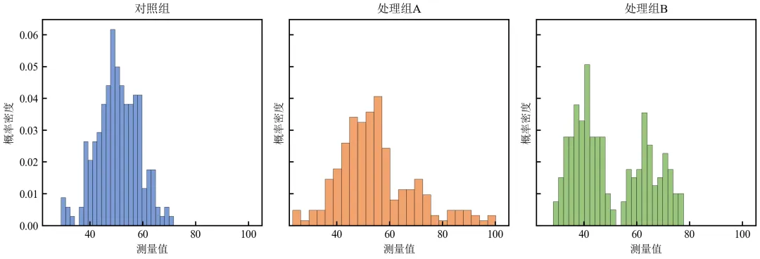 对照组呈对称分布,处理组A右偏,处理组B呈现双峰特征,直观展示组间异质性。