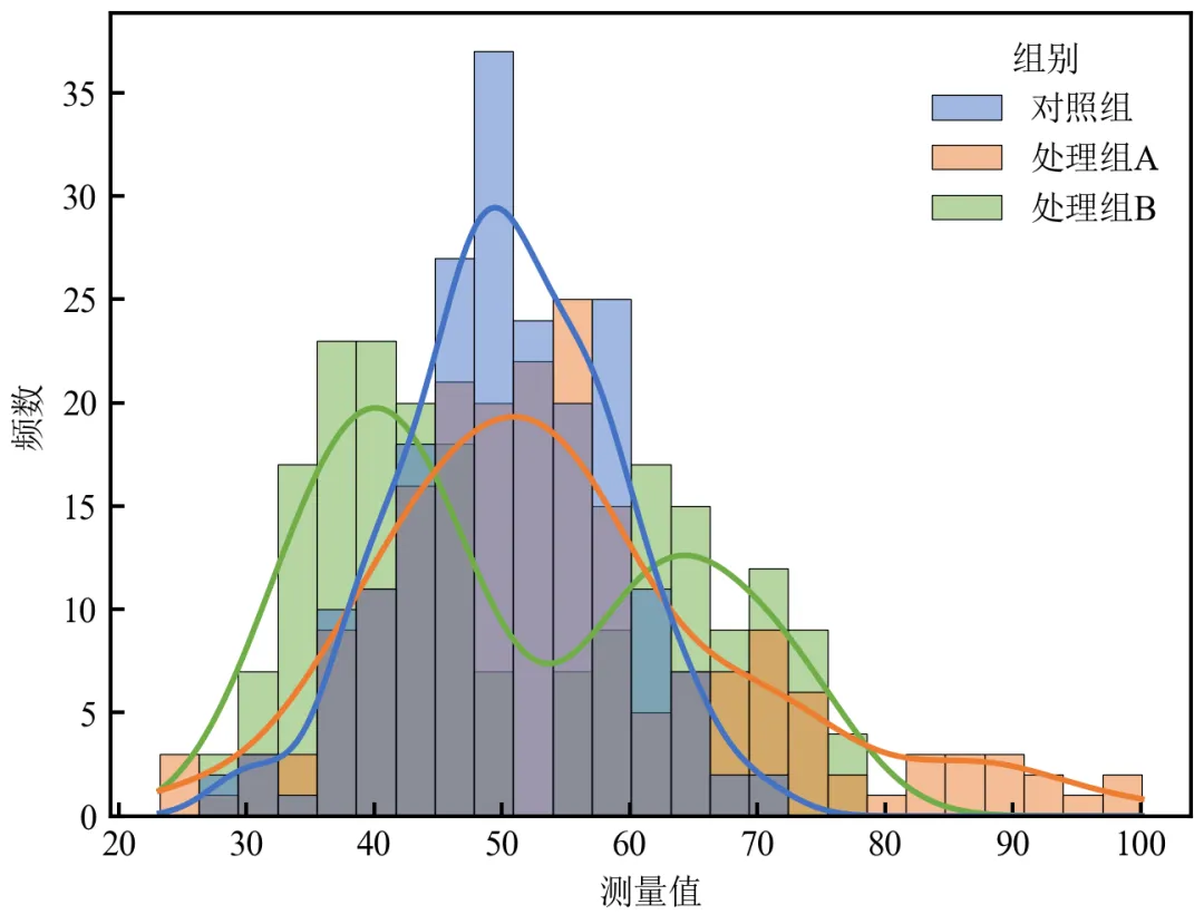 import pandas as pdimport matplotlib.pyplot as pltimport seaborn as snsdefset_academic_style(): plt.rcParams['font.family'] = ['Times New Roman', 'SimSun'] plt.rcParams['font.size'] = 9 plt.rcParams['axes.unicode_minus'] = False plt.rcParams['axes.linewidth'] = 1.0 plt.rcParams['xtick.major.width'] = 1.0 plt.rcParams['ytick.major.width'] = 1.0 plt.rcParams['xtick.major.size'] = 3.5 plt.rcParams['ytick.major.size'] = 3.5 plt.rcParams['xtick.direction'] = 'in' plt.rcParams['ytick.direction'] = 'in' plt.rcParams['legend.frameon'] = False plt.rcParams['pdf.fonttype'] = 42 plt.rcParams['savefig.dpi'] = 300set_academic_style()df = pd.read_csv('三组实验数据.csv')fig, ax = plt.subplots(figsize=(4.5, 3.5))# 使用seaborn的histplot,设置元素类型和透明度sns.histplot(data=df, x='测量值', hue='组别', bins=25, alpha=0.5, kde=True, palette=['#4472C4', '#ED7D31', '#70AD47'], edgecolor='black', linewidth=0.3, ax=ax)ax.set_xlabel('测量值')ax.set_ylabel('频数')# Seaborn图例默认有边框,需手动去除legend = ax.get_legend()if legend: legend.set_frame_on(False)plt.tight_layout()plt.show()fig.savefig('Seaborn分组直方图_KDE.pdf', bbox_inches='tight', pad_inches=0.05)fig.savefig('Seaborn分组直方图_KDE.png', bbox_inches='tight', pad_inches=0.05)执行结果分析: