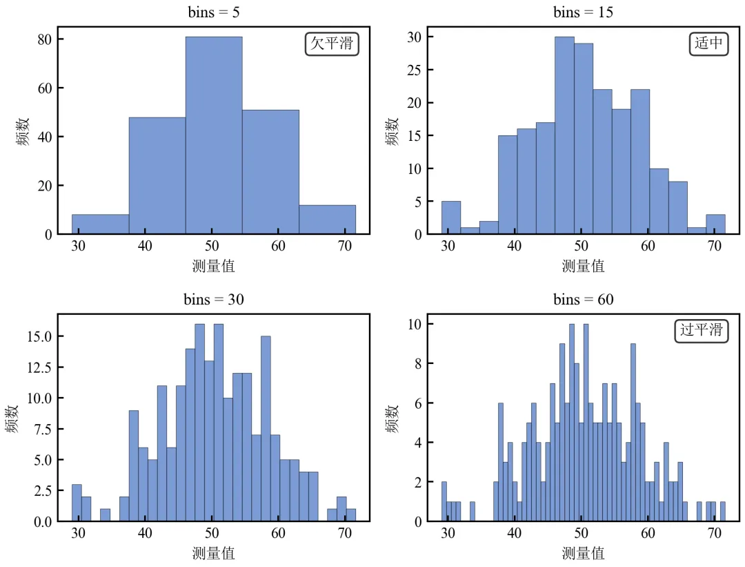 import pandas as pdimport numpy as npimport matplotlib.pyplot as pltdefset_academic_style(): plt.rcParams['font.family'] = ['Times New Roman', 'SimSun'] plt.rcParams['font.size'] = 9 plt.rcParams['axes.unicode_minus'] = False plt.rcParams['axes.linewidth'] = 1.0 plt.rcParams['xtick.major.width'] = 1.0 plt.rcParams['ytick.major.width'] = 1.0 plt.rcParams['xtick.major.size'] = 3.5 plt.rcParams['ytick.major.size'] = 3.5 plt.rcParams['xtick.direction'] = 'in' plt.rcParams['ytick.direction'] = 'in' plt.rcParams['legend.frameon'] = False plt.rcParams['pdf.fonttype'] = 42 plt.rcParams['savefig.dpi'] = 300set_academic_style()df = pd.read_csv('三组实验数据.csv')# 使用对照组数据作为示例data = df[df['组别'] == '对照组']['测量值'].values# 定义不同bins值bins_list = [5, 15, 30, 60]fig, axes = plt.subplots(2, 2, figsize=(6.5, 5.0))axes = axes.flatten()for ax, bins in zip(axes, bins_list): ax.hist(data, bins=bins, color='#4472C4', alpha=0.7, edgecolor='black', linewidth=0.3) ax.set_title(f'bins = {bins}', fontsize=10) ax.set_xlabel('测量值') ax.set_ylabel('频数')# 添加描述标签if bins == 5: ax.text(0.95, 0.95, '欠平滑', transform=ax.transAxes, ha='right', va='top', bbox=dict(boxstyle='round', facecolor='white', alpha=0.8))elif bins == 15: ax.text(0.95, 0.95, '适中', transform=ax.transAxes, ha='right', va='top', bbox=dict(boxstyle='round', facecolor='white', alpha=0.8))elif bins == 60: ax.text(0.95, 0.95, '过平滑', transform=ax.transAxes, ha='right', va='top', bbox=dict(boxstyle='round', facecolor='white', alpha=0.8))plt.tight_layout()plt.show()fig.savefig('bins参数对比网格.pdf', bbox_inches='tight', pad_inches=0.05)fig.savefig('bins参数对比网格.png', bbox_inches='tight', pad_inches=0.05)执行结果分析:
