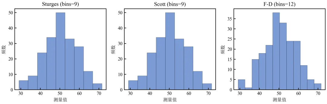 import pandas as pdimport numpy as npimport matplotlib.pyplot as pltdefset_academic_style(): plt.rcParams['font.family'] = ['Times New Roman', 'SimSun'] plt.rcParams['font.size'] = 9 plt.rcParams['axes.unicode_minus'] = False plt.rcParams['axes.linewidth'] = 1.0 plt.rcParams['xtick.major.width'] = 1.0 plt.rcParams['ytick.major.width'] = 1.0 plt.rcParams['xtick.major.size'] = 3.5 plt.rcParams['ytick.major.size'] = 3.5 plt.rcParams['xtick.direction'] = 'in' plt.rcParams['ytick.direction'] = 'in' plt.rcParams['legend.frameon'] = False plt.rcParams['pdf.fonttype'] = 42 plt.rcParams['savefig.dpi'] = 300set_academic_style()df = pd.read_csv('三组实验数据.csv')data = df[df['组别'] == '对照组']['测量值'].valuesn = len(data)# 计算三种规则推荐的bins数# Sturges: k = ceil(log2(n) + 1)bins_sturges = int(np.ceil(np.log2(n) + 1))# Scott: bin_width = 3.5 * std / n^(1/3) → bins = range / widthbin_width_scott = 3.5 * np.std(data) / (n ** (1/3))bins_scott = int(np.ceil((data.max() - data.min()) / bin_width_scott))# Freedman-Diaconis: bin_width = 2 * IQR / n^(1/3)iqr = np.percentile(data, 75) - np.percentile(data, 25)bin_width_fd = 2 * iqr / (n ** (1/3))bins_fd = int(np.ceil((data.max() - data.min()) / bin_width_fd))print(f"Sturges推荐bins: {bins_sturges}")print(f"Scott推荐bins: {bins_scott}")print(f"Freedman-Diaconis推荐bins: {bins_fd}")# 绘制三个推荐bins的直方图对比fig, axes = plt.subplots(1, 3, figsize=(9.0, 3.0))bins_dict = {'Sturges': bins_sturges, 'Scott': bins_scott, 'F-D': bins_fd}for ax, (name, b) in zip(axes, bins_dict.items()): ax.hist(data, bins=b, color='#4472C4', alpha=0.7, edgecolor='black', linewidth=0.3) ax.set_title(f'{name} (bins={b})') ax.set_xlabel('测量值') ax.set_ylabel('频数')plt.tight_layout()plt.show()fig.savefig('自动bins规则对比.pdf', bbox_inches='tight', pad_inches=0.05)fig.savefig('自动bins规则对比.png', bbox_inches='tight', pad_inches=0.05)执行结果分析: