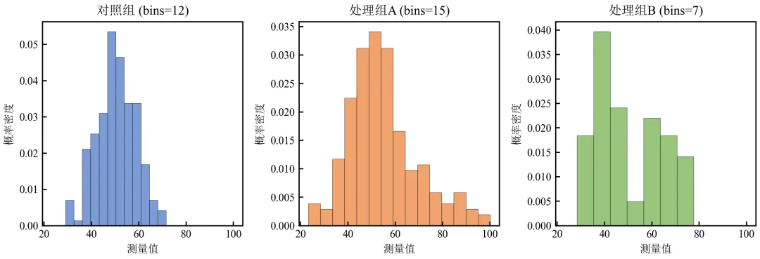 import pandas as pdimport numpy as npimport matplotlib.pyplot as pltdefset_academic_style(): plt.rcParams['font.family'] = ['Times New Roman', 'SimSun'] plt.rcParams['font.size'] = 9 plt.rcParams['axes.unicode_minus'] = False plt.rcParams['axes.linewidth'] = 1.0 plt.rcParams['xtick.major.width'] = 1.0 plt.rcParams['ytick.major.width'] = 1.0 plt.rcParams['xtick.major.size'] = 3.5 plt.rcParams['ytick.major.size'] = 3.5 plt.rcParams['xtick.direction'] = 'in' plt.rcParams['ytick.direction'] = 'in' plt.rcParams['legend.frameon'] = False plt.rcParams['pdf.fonttype'] = 42 plt.rcParams['savefig.dpi'] = 300set_academic_style()df = pd.read_csv('三组实验数据.csv')groups = df['组别'].unique()colors = {'对照组': '#4472C4', '处理组A': '#ED7D31', '处理组B': '#70AD47'}fig, axes = plt.subplots(1, 3, figsize=(9.0, 3.2), sharex=True, sharey=False)for ax, group in zip(axes, groups): data = df[df['组别'] == group]['测量值'].values n = len(data)# 使用Freedman-Diaconis规则计算bins iqr = np.percentile(data, 75) - np.percentile(data, 25) bin_width = 2 * iqr / (n ** (1/3)) bins = int(np.ceil((data.max() - data.min()) / bin_width)) ax.hist(data, bins=bins, density=True, color=colors[group], alpha=0.7, edgecolor='black', linewidth=0.3) ax.set_title(f'{group} (bins={bins})') ax.set_xlabel('测量值') ax.set_ylabel('概率密度')plt.tight_layout()plt.show()fig.savefig('分组最优bins直方图.pdf', bbox_inches='tight', pad_inches=0.05)fig.savefig('分组最优bins直方图.png', bbox_inches='tight', pad_inches=0.05)执行结果分析: