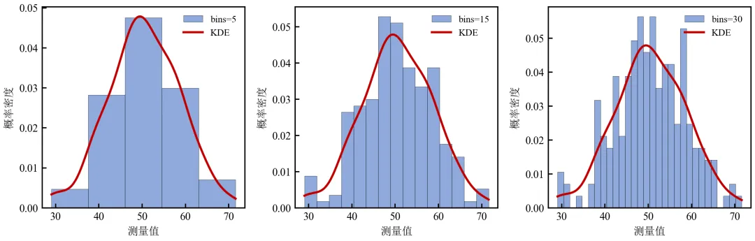 bins=5过于平滑,丢失峰部细节;bins=30出现噪声波动,与KDE偏离。