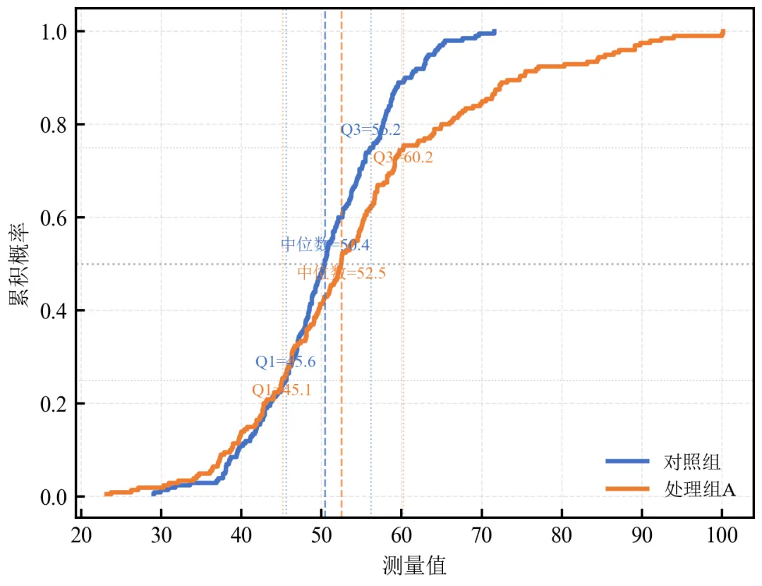 import pandas as pdimport numpy as npimport matplotlib.pyplot as pltdefset_academic_style(): plt.rcParams['font.family'] = ['Times New Roman', 'SimSun'] plt.rcParams['font.size'] = 9 plt.rcParams['axes.unicode_minus'] = False plt.rcParams['axes.linewidth'] = 1.0 plt.rcParams['xtick.major.width'] = 1.0 plt.rcParams['ytick.major.width'] = 1.0 plt.rcParams['xtick.major.size'] = 3.5 plt.rcParams['ytick.major.size'] = 3.5 plt.rcParams['xtick.direction'] = 'in' plt.rcParams['ytick.direction'] = 'in' plt.rcParams['legend.frameon'] = False plt.rcParams['pdf.fonttype'] = 42 plt.rcParams['savefig.dpi'] = 300set_academic_style()df = pd.read_csv('三组实验数据.csv')control = df[df['组别'] == '对照组']['测量值'].valuestreat_a = df[df['组别'] == '处理组A']['测量值'].valuesdefecdf(data): x = np.sort(data) y = np.arange(1, len(data)+1) / len(data)return x, yx_ctrl, y_ctrl = ecdf(control)x_a, y_a = ecdf(treat_a)fig, ax = plt.subplots(figsize=(4.5, 3.5))ax.step(x_ctrl, y_ctrl, where='post', color='#4472C4', linewidth=1.8, label='对照组')ax.step(x_a, y_a, where='post', color='#ED7D31', linewidth=1.8, label='处理组A')# 绘制水平参考线(只画一次)ax.axhline(y=0.5, color='gray', linestyle=':', linewidth=0.8, alpha=0.6)ax.axhline(y=0.25, color='gray', linestyle=':', linewidth=0.5, alpha=0.4)ax.axhline(y=0.75, color='gray', linestyle=':', linewidth=0.5, alpha=0.4)# 标注中位数和四分位数# 对照组median_ctrl = np.median(control)q1_ctrl = np.percentile(control, 25)q3_ctrl = np.percentile(control, 75)ax.axvline(x=median_ctrl, color='#4472C4', linestyle='--', linewidth=0.8, alpha=0.7)ax.axvline(x=q1_ctrl, color='#4472C4', linestyle=':', linewidth=0.6, alpha=0.5)ax.axvline(x=q3_ctrl, color='#4472C4', linestyle=':', linewidth=0.6, alpha=0.5)ax.text(median_ctrl, 0.53, f'中位数={median_ctrl:.1f}', color='#4472C4', fontsize=7, ha='center')ax.text(q1_ctrl, 0.28, f'Q1={q1_ctrl:.1f}', color='#4472C4', fontsize=7, ha='center')ax.text(q3_ctrl, 0.78, f'Q3={q3_ctrl:.1f}', color='#4472C4', fontsize=7, ha='center')# 处理组Amedian_a = np.median(treat_a)q1_a = np.percentile(treat_a, 25)q3_a = np.percentile(treat_a, 75)ax.axvline(x=median_a, color='#ED7D31', linestyle='--', linewidth=0.8, alpha=0.7)ax.axvline(x=q1_a, color='#ED7D31', linestyle=':', linewidth=0.6, alpha=0.5)ax.axvline(x=q3_a, color='#ED7D31', linestyle=':', linewidth=0.6, alpha=0.5)ax.text(median_a, 0.47, f'中位数={median_a:.1f}', color='#ED7D31', fontsize=7, ha='center')ax.text(q1_a, 0.22, f'Q1={q1_a:.1f}', color='#ED7D31', fontsize=7, ha='center')ax.text(q3_a, 0.72, f'Q3={q3_a:.1f}', color='#ED7D31', fontsize=7, ha='center')ax.set_xlabel('测量值')ax.set_ylabel('累积概率')ax.legend(loc='lower right', fontsize=8)ax.grid(alpha=0.3, linestyle='--', linewidth=0.5)plt.tight_layout()plt.show()fig.savefig('ECDF标注百分位数.pdf', bbox_inches='tight', pad_inches=0.05)fig.savefig('ECDF标注百分位数.png', bbox_inches='tight', pad_inches=0.05)执行结果分析: