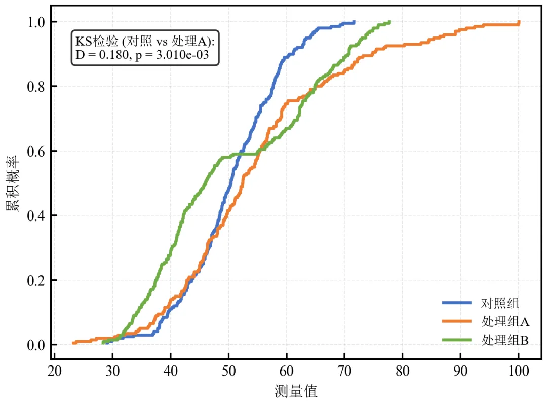 import pandas as pdimport numpy as npimport matplotlib.pyplot as pltfrom scipy.stats import ks_2sampdefset_academic_style(): plt.rcParams['font.family'] = ['Times New Roman', 'SimSun'] plt.rcParams['font.size'] = 9 plt.rcParams['axes.unicode_minus'] = False plt.rcParams['axes.linewidth'] = 1.0 plt.rcParams['xtick.major.width'] = 1.0 plt.rcParams['ytick.major.width'] = 1.0 plt.rcParams['xtick.major.size'] = 3.5 plt.rcParams['ytick.major.size'] = 3.5 plt.rcParams['xtick.direction'] = 'in' plt.rcParams['ytick.direction'] = 'in' plt.rcParams['legend.frameon'] = False plt.rcParams['pdf.fonttype'] = 42 plt.rcParams['savefig.dpi'] = 300set_academic_style()df = pd.read_csv('三组实验数据.csv')groups = ['对照组', '处理组A', '处理组B']colors = ['#4472C4', '#ED7D31', '#70AD47']defecdf(data): x = np.sort(data) y = np.arange(1, len(data)+1) / len(data)return x, yfig, ax = plt.subplots(figsize=(4.8, 3.6))for group, color in zip(groups, colors): data = df[df['组别'] == group]['测量值'].values x_ecdf, y_ecdf = ecdf(data) ax.step(x_ecdf, y_ecdf, where='post', color=color, linewidth=1.8, label=group)# 对照组 vs 处理组A KS检验ctrl = df[df['组别'] == '对照组']['测量值'].valuestreat_a = df[df['组别'] == '处理组A']['测量值'].valuesks_stat, p_value = ks_2samp(ctrl, treat_a)ax.text(0.05, 0.85, f'KS检验 (对照 vs 处理A):\nD = {ks_stat:.3f}, p = {p_value:.3e}', transform=ax.transAxes, fontsize=8, bbox=dict(boxstyle='round', facecolor='white', alpha=0.8))ax.set_xlabel('测量值')ax.set_ylabel('累积概率')ax.legend(loc='lower right', fontsize=8)ax.grid(alpha=0.3, linestyle='--', linewidth=0.5)plt.tight_layout()plt.show()fig.savefig('ECDF多组_KS检验.pdf', bbox_inches='tight', pad_inches=0.05)fig.savefig('ECDF多组_KS检验.png', bbox_inches='tight', pad_inches=0.05)执行结果分析: