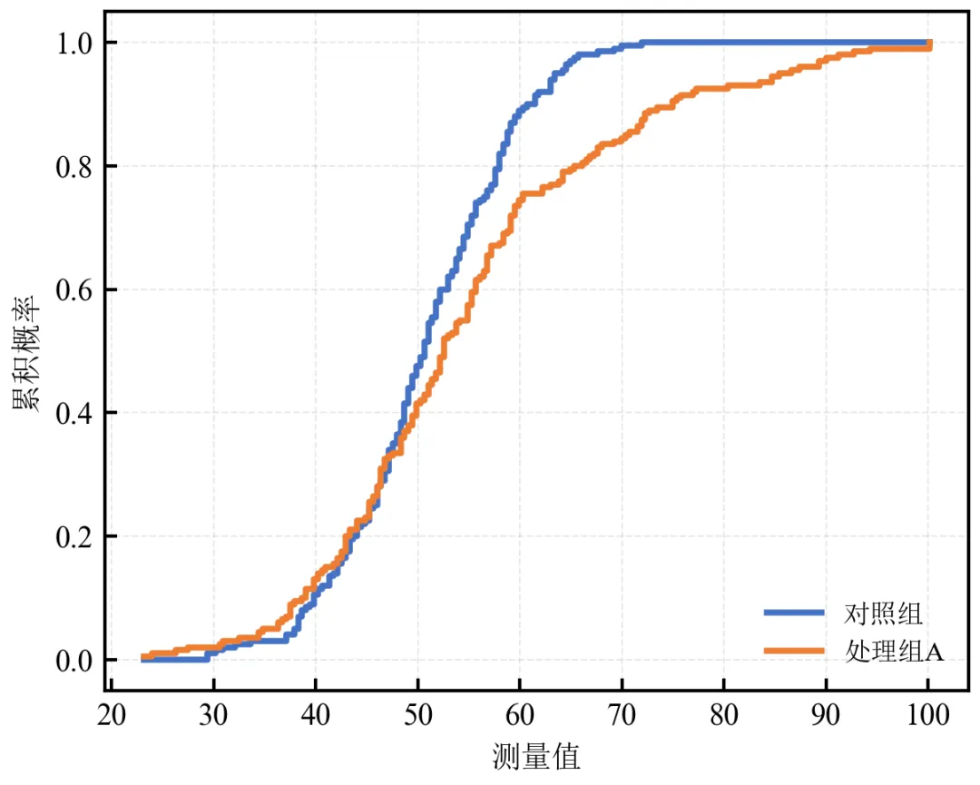 绘制对照组与处理组A的经验累积分布函数,直观比较分布位置和形状。