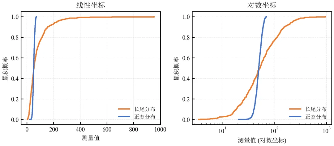 import pandas as pdimport numpy as npimport matplotlib.pyplot as pltdefset_academic_style(): plt.rcParams['font.family'] = ['Times New Roman', 'SimSun'] plt.rcParams['font.size'] = 9 plt.rcParams['axes.unicode_minus'] = False plt.rcParams['axes.linewidth'] = 1.0 plt.rcParams['xtick.major.width'] = 1.0 plt.rcParams['ytick.major.width'] = 1.0 plt.rcParams['xtick.major.size'] = 3.5 plt.rcParams['ytick.major.size'] = 3.5 plt.rcParams['xtick.direction'] = 'in' plt.rcParams['ytick.direction'] = 'in' plt.rcParams['legend.frameon'] = False plt.rcParams['pdf.fonttype'] = 42 plt.rcParams['savefig.dpi'] = 300set_academic_style()# 模拟长尾数据(处理组A本身是对数正态,已具长尾;为演示更明显,可生成新数据)np.random.seed(2024)long_tail = np.random.lognormal(mean=4.0, sigma=0.8, size=500) # 更明显的长尾normal_data = np.random.normal(50, 8, 500)defecdf(data): x = np.sort(data) y = np.arange(1, len(data)+1) / len(data)return x, yx_lt, y_lt = ecdf(long_tail)x_norm, y_norm = ecdf(normal_data)fig, (ax1, ax2) = plt.subplots(1, 2, figsize=(7.0, 3.2))# 线性坐标ax1.step(x_lt, y_lt, where='post', color='#ED7D31', linewidth=1.8, label='长尾分布')ax1.step(x_norm, y_norm, where='post', color='#4472C4', linewidth=1.8, label='正态分布')ax1.set_xlabel('测量值')ax1.set_ylabel('累积概率')ax1.legend(loc='lower right', fontsize=8)ax1.grid(alpha=0.3, linestyle='--', linewidth=0.5)ax1.set_title('线性坐标')# 对数坐标ax2.step(x_lt, y_lt, where='post', color='#ED7D31', linewidth=1.8, label='长尾分布')ax2.step(x_norm, y_norm, where='post', color='#4472C4', linewidth=1.8, label='正态分布')ax2.set_xscale('log')ax2.set_xlabel('测量值 (对数坐标)')ax2.set_ylabel('累积概率')ax2.legend(loc='lower right', fontsize=8)ax2.grid(alpha=0.3, linestyle='--', linewidth=0.5)ax2.set_title('对数坐标')plt.tight_layout()plt.show()fig.savefig('ECDF对数坐标.pdf', bbox_inches='tight', pad_inches=0.05)fig.savefig('ECDF对数坐标.png', bbox_inches='tight', pad_inches=0.05)执行结果分析: