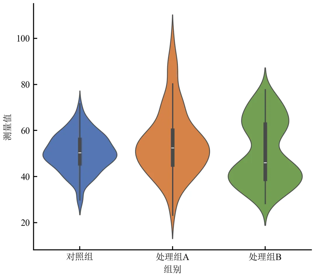 import pandas as pdimport matplotlib.pyplot as pltimport seaborn as snsdefset_academic_style(): plt.rcParams['font.family'] = ['Times New Roman', 'SimSun'] plt.rcParams['font.size'] = 9 plt.rcParams['axes.unicode_minus'] = False plt.rcParams['axes.linewidth'] = 1.0 plt.rcParams['xtick.major.width'] = 1.0 plt.rcParams['ytick.major.width'] = 1.0 plt.rcParams['xtick.major.size'] = 3.5 plt.rcParams['ytick.major.size'] = 3.5 plt.rcParams['xtick.direction'] = 'in' plt.rcParams['ytick.direction'] = 'in' plt.rcParams['legend.frameon'] = False plt.rcParams['pdf.fonttype'] = 42 plt.rcParams['savefig.dpi'] = 300set_academic_style()df = pd.read_csv('三组实验数据.csv')fig, ax = plt.subplots(figsize=(4.5, 4.0))sns.violinplot(data=df, x='组别', y='测量值', inner='box', palette=['#4472C4', '#ED7D31', '#70AD47'], linewidth=0.8, ax=ax)ax.set_xlabel('组别')ax.set_ylabel('测量值')# 去除上、右 spinessns.despine()plt.tight_layout()plt.show()fig.savefig('小提琴图_基础.pdf', bbox_inches='tight', pad_inches=0.05)fig.savefig('小提琴图_基础.png', bbox_inches='tight', pad_inches=0.05)执行结果分析:
