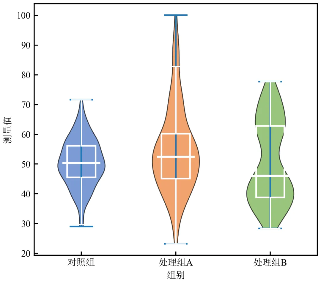 import pandas as pdimport numpy as npimport matplotlib.pyplot as pltdefset_academic_style(): plt.rcParams['font.family'] = ['Times New Roman', 'SimSun'] plt.rcParams['font.size'] = 9 plt.rcParams['axes.unicode_minus'] = False plt.rcParams['axes.linewidth'] = 1.0 plt.rcParams['xtick.major.width'] = 1.0 plt.rcParams['ytick.major.width'] = 1.0 plt.rcParams['xtick.major.size'] = 3.5 plt.rcParams['ytick.major.size'] = 3.5 plt.rcParams['xtick.direction'] = 'in' plt.rcParams['ytick.direction'] = 'in' plt.rcParams['legend.frameon'] = False plt.rcParams['pdf.fonttype'] = 42 plt.rcParams['savefig.dpi'] = 300set_academic_style()df = pd.read_csv('三组实验数据.csv')groups = df['组别'].unique()data_list = [df[df['组别'] == g]['测量值'].values for g in groups]colors = ['#4472C4', '#ED7D31', '#70AD47']fig, ax = plt.subplots(figsize=(4.5, 4.0))# 绘制小提琴图parts = ax.violinplot(data_list, positions=[1, 2, 3], showmeans=False, showmedians=False)# 自定义小提琴外观for i, pc in enumerate(parts['bodies']): pc.set_facecolor(colors[i]) pc.set_edgecolor('black') pc.set_linewidth(0.8) pc.set_alpha(0.7)# 叠加箱线图(手动绘制关键统计量)for i, data in enumerate(data_list): pos = i + 1# 计算统计量 q1, median, q3 = np.percentile(data, [25, 50, 75]) iqr = q3 - q1 whisker_low = np.max([data.min(), q1 - 1.5 * iqr]) whisker_high = np.min([data.max(), q3 + 1.5 * iqr])# 绘制箱线图元素# 中位线 ax.plot([pos-0.2, pos+0.2], [median, median], color='white', linewidth=2, solid_capstyle='butt')# 箱体(IQR) box = plt.Rectangle((pos-0.15, q1), 0.3, iqr, fill=False, edgecolor='white', linewidth=1.5) ax.add_patch(box)# 须线 ax.plot([pos, pos], [whisker_low, q1], color='white', linewidth=1.2) ax.plot([pos, pos], [q3, whisker_high], color='white', linewidth=1.2) ax.plot([pos-0.1, pos+0.1], [whisker_low, whisker_low], color='white', linewidth=1.2) ax.plot([pos-0.1, pos+0.1], [whisker_high, whisker_high], color='white', linewidth=1.2)ax.set_xticks([1, 2, 3])ax.set_xticklabels(groups)ax.set_xlabel('组别')ax.set_ylabel('测量值')ax.set_xlim(0.5, 3.5)plt.tight_layout()plt.show()fig.savefig('小提琴图_自定义箱线.pdf', bbox_inches='tight', pad_inches=0.05)fig.savefig('小提琴图_自定义箱线.png', bbox_inches='tight', pad_inches=0.05)执行结果分析: