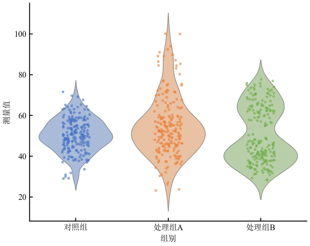 小提琴宽度反映概率密度,处理组A右偏、处理组B双峰形态一目了然。