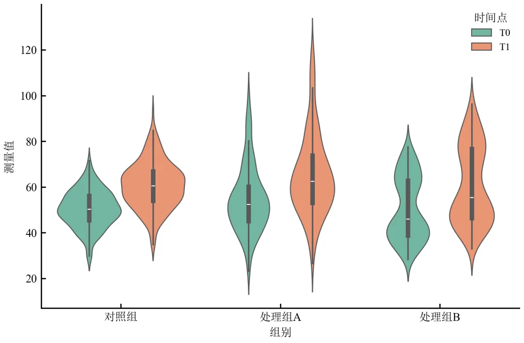 import pandas as pdimport numpy as npimport matplotlib.pyplot as pltimport seaborn as snsdefset_academic_style(): plt.rcParams['font.family'] = ['Times New Roman', 'SimSun'] plt.rcParams['font.size'] = 9 plt.rcParams['axes.unicode_minus'] = False plt.rcParams['axes.linewidth'] = 1.0 plt.rcParams['xtick.major.width'] = 1.0 plt.rcParams['ytick.major.width'] = 1.0 plt.rcParams['xtick.major.size'] = 3.5 plt.rcParams['ytick.major.size'] = 3.5 plt.rcParams['xtick.direction'] = 'in' plt.rcParams['ytick.direction'] = 'in' plt.rcParams['legend.frameon'] = False plt.rcParams['pdf.fonttype'] = 42 plt.rcParams['savefig.dpi'] = 300set_academic_style()# 扩展数据:添加“时间点”变量np.random.seed(2024)df = pd.read_csv('三组实验数据.csv')# 复制数据,增加时间点维度df_time = df.copy()df_time['时间点'] = 'T0'df2 = df.copy()df2['时间点'] = 'T1'df2['测量值'] = df2['测量值'] * np.random.uniform(1.1, 1.3, len(df2)) # T1整体上移df_long = pd.concat([df_time, df2], ignore_index=True)fig, ax = plt.subplots(figsize=(6.0, 4.0))sns.violinplot(data=df_long, x='组别', y='测量值', hue='时间点', split=False, inner='box', palette='Set2', linewidth=0.8, ax=ax)ax.set_xlabel('组别')ax.set_ylabel('测量值')ax.legend(title='时间点', frameon=False, fontsize=8)sns.despine()plt.tight_layout()plt.show()fig.savefig('小提琴图_分组对比.pdf', bbox_inches='tight', pad_inches=0.05)fig.savefig('小提琴图_分组对比.png', bbox_inches='tight', pad_inches=0.05)执行结果分析: