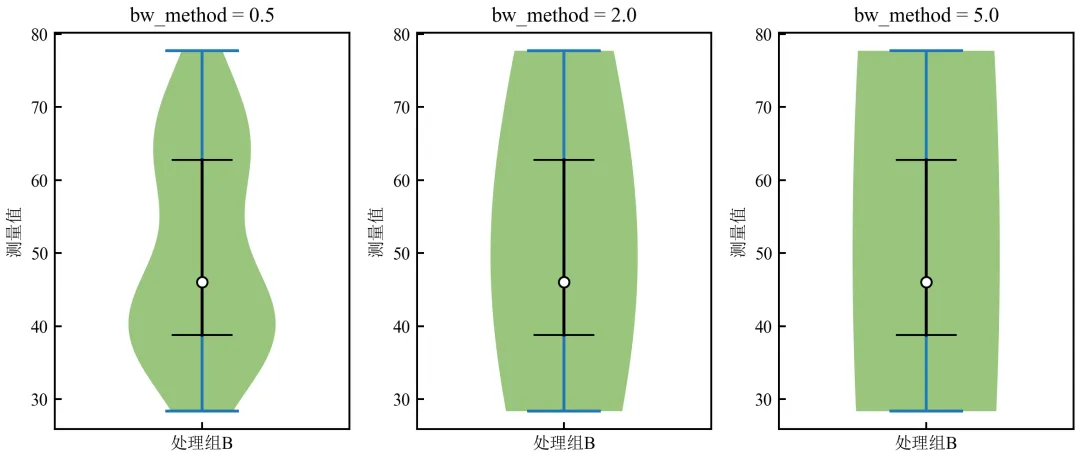 import pandas as pdimport numpy as npimport matplotlib.pyplot as pltimport seaborn as snsdefset_academic_style(): plt.rcParams['font.family'] = ['Times New Roman', 'SimSun'] plt.rcParams['font.size'] = 9 plt.rcParams['axes.unicode_minus'] = False plt.rcParams['axes.linewidth'] = 1.0 plt.rcParams['xtick.major.width'] = 1.0 plt.rcParams['ytick.major.width'] = 1.0 plt.rcParams['xtick.major.size'] = 3.5 plt.rcParams['ytick.major.size'] = 3.5 plt.rcParams['xtick.direction'] = 'in' plt.rcParams['ytick.direction'] = 'in' plt.rcParams['legend.frameon'] = False plt.rcParams['pdf.fonttype'] = 42 plt.rcParams['savefig.dpi'] = 300set_academic_style()df = pd.read_csv('三组实验数据.csv')# 使用处理组B(双峰)演示带宽影响data_b = df[df['组别'] == '处理组B']['测量值'].valuesfig, axes = plt.subplots(1, 3, figsize=(8.0, 3.5))bw_values = [0.5, 2.0, 5.0] # 相对于标准带宽的缩放因子for ax, bw in zip(axes, bw_values):# 使用matplotlib的violinplot,可控制带宽 parts = ax.violinplot([data_b], positions=[1], bw_method=bw, showmeans=False, showmedians=False) parts['bodies'][0].set_facecolor('#70AD47') parts['bodies'][0].set_alpha(0.7)# 添加箱线信息 q1, med, q3 = np.percentile(data_b, [25, 50, 75]) ax.scatter(1, med, color='white', edgecolor='black', s=30, zorder=3) ax.plot([0.9, 1.1], [q1, q1], color='black', linewidth=1) ax.plot([0.9, 1.1], [q3, q3], color='black', linewidth=1) ax.plot([1, 1], [q1, q3], color='black', linewidth=1.5) ax.set_title(f'bw_method = {bw}') ax.set_xticks([1]) ax.set_xticklabels(['处理组B']) ax.set_ylabel('测量值') ax.set_xlim(0.5, 1.5)plt.tight_layout()plt.show()fig.savefig('小提琴图_带宽调整.pdf', bbox_inches='tight', pad_inches=0.05)fig.savefig('小提琴图_带宽调整.png', bbox_inches='tight', pad_inches=0.05)执行结果分析: