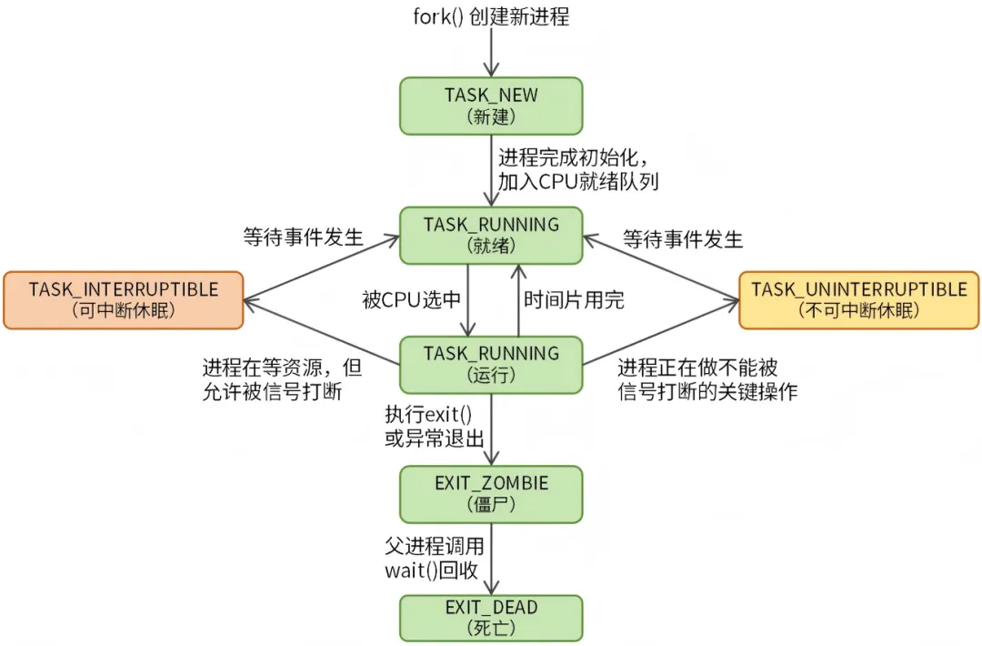 当用户程序调用 fork 函数创建进程时,内核首先会创建一个 task_struct 对象(进程),此时进程处于 TASK_NEW 状态(进程刚创建未初始化完成的状态),当进程完成初始化后,进程会加入 CPU 就绪队列,此时进程处于 TASK_RUNNING(就绪态),如果进程被 CPU 选中,CPU 会执行进程中的代码,进程切换至 TASK_RUNNING(运行态)。当进程的时间片用完,进程会重新加入 CPU 就绪队列,进程状态又变为 TASK_RUNNING(就绪态)。