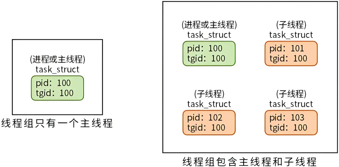 如果线程组只有一个进程,我们把它称为单线程进程,单线程进程的只有一个主线程,主线程的 pid 和 tgid 相等,并且线程组组长(task_struct 的 group_leader 成员)指向自身。