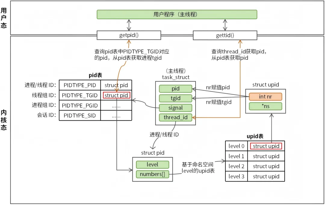 task_struct 维护了一个 pid 表(signal 字段),pid 表中每个元素为:不同类型的 ID 对应的 struct pid 结构。PIDTYPE_TGID 表示 tgid 对应的 struct pid 结构,struct pid 结构中有一个 upid 表,表中的每个元素为:命名空间级别对应的 struct upid 结构,struct upid结构中的 nr 就是 ID 信息,命名空间 level 0对应的nr 最终会赋值给主线程pid 和 tgid。