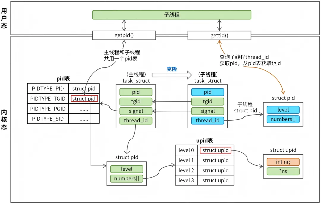 子线程和主线程通过 gettid 获取的是进程 pid 是不一样的,因为内核创建子线程时,会新创建一个 struct pid 结构并初始化,子线程 task_struct 的 thread_id 指向新的 struct pid 结构,所以子线程获取到的是一个独立的 pid。