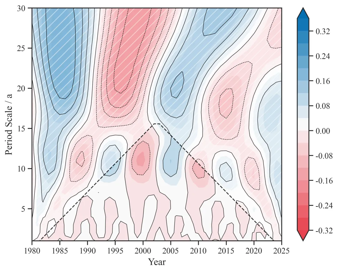 横轴表示时间,纵轴表示周期尺度,颜色表示小波系数实部的大小和正负。我们可以把它理解为一张“周期活动地图”,在哪一年、在哪个尺度上波动明显,这张图都会显示出来。颜色越深,说明该时间和尺度上的波动越突出;红蓝则表示振荡处于不同相位状态。图上的黑色等值线是为了帮助我们更清楚地看出强波动区域的轮廓。