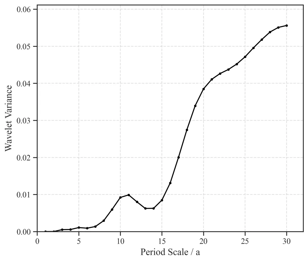 图2展示了各周期尺度下的小波方差值,横轴为周期尺度(单位为年),纵轴为小波方差值。小波方差表示在该尺度下波动的强度,值越高,说明该尺度的波动越显著。