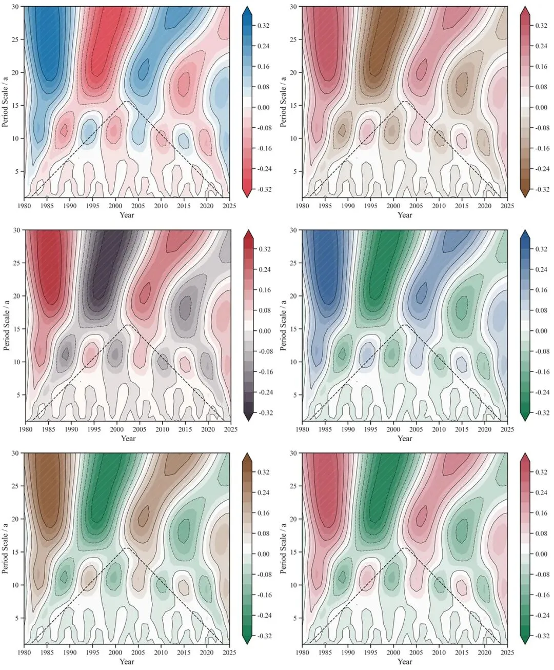 趋势分析:通过颜色变化的渐变,可以提取周期性波动的趋势,例如一些尺度周期在2000年以后持续变化,可能表明数据在该时期发生了系统性的变化。