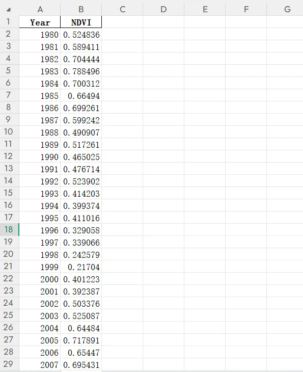 我们需要准备数据,数据格式如下:第一列是年份,第二列是指标值。保存Excel格式,将我们的代码和Excel文件放在同一个文件夹内。