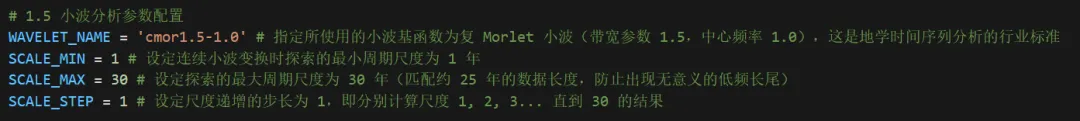 我们今天要分享一套代码,专门用于输出小波实部时频图和小波方差分布图。这套代码先从 Excel 中读取两列数据,第一列是年份,第二列是指标值。然后利用连续小波变换,对 1 到 30 年尺度范围内的波动特征进行分析。代码选用的是复 Morlet 小波,这是一种在科研中较常用的小波基,适合识别时间序列中的周期振荡。