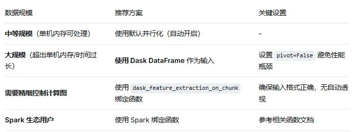 官方文档提到也支持PySpark,可以通过类似 tsfresh.convenience.bindings.spark_feature_extraction_on_chunk() 的函数,将特征提取整合到Spark计算图中,适合已在使用Spark生态系统的用户
