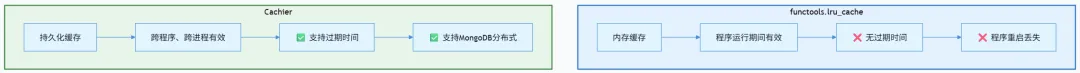 适合中慢速函数:Cachier本身有约1毫秒的开销,适合耗时1秒以上的函数;如果是微秒级的快速函数,建议用 lru_cache