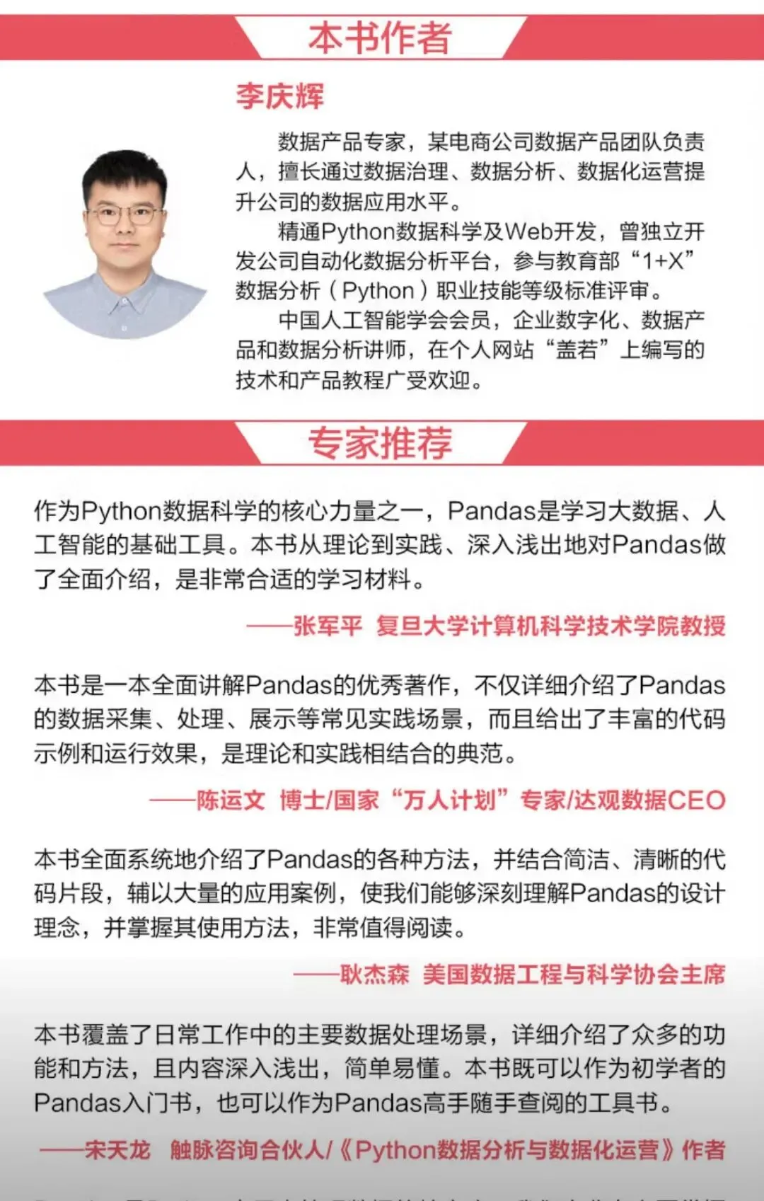 如果你想充分发挥Python的强大作用,如果你想成为一名好的Python工程师,你应该先学好Pandas。这是一本全面覆盖了Pandas使用者的普遍需求和痛点的著作,基于实用、易学的原则,从功能、使用、原理等多个维度对Pandas做了全方位的详细讲解,既是初学者系统学习Pandas难得的入门书,又是有经验的Python工程师案头必不可少的查询手册。
