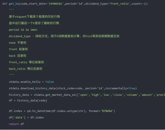 以下是一个基于xtquant + miniQMT 获取股票行情的方法,后面的行情Dataframe 数据都会 通过这个方法来获取: