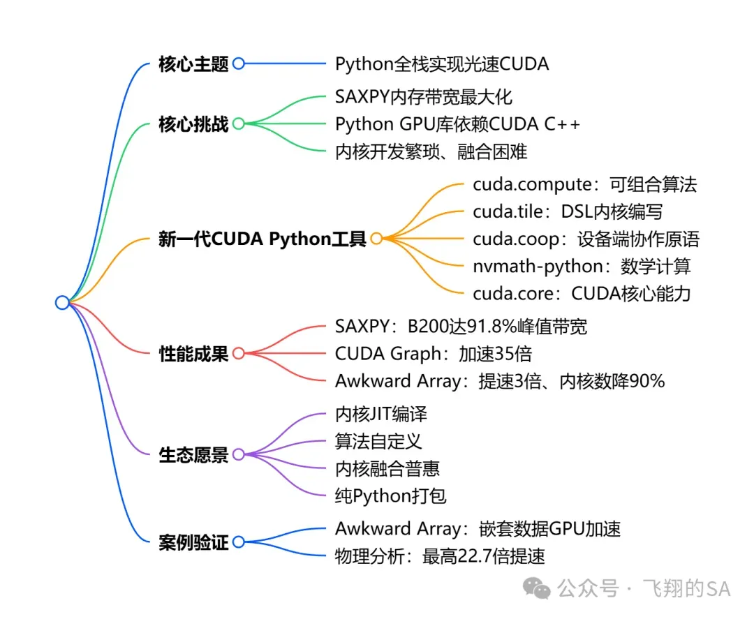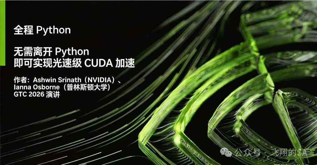 NVIDIA在GTC 2026发布了CUDA Python新一代工具栈演讲,核心是实现纯Python编写光速CUDA,通过cuda.compute、cuda.tile、cuda.core等组件,达成比肩甚至超越CUDA C++的性能,SAXPY在B200上带宽利用率达91.8%,并以Awkward Array为案例验证,推动GPU库生态走向Python All The Way Down,简化开发、降低维护成本、提升打包效率。本文带来本次演讲的解读。